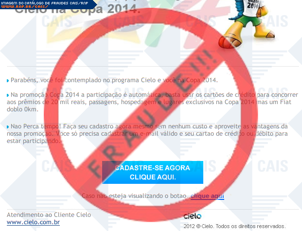 | comentário | O fraudador envia um email contendo proposta falsa de promoção referente a copa do mundo de 2014 para o usuario com intuito de adquirir os seus dados pessoais. No email existe um link disponivel para cadastramento da promoção que direciona o usuario a uma... (leia mais) | |