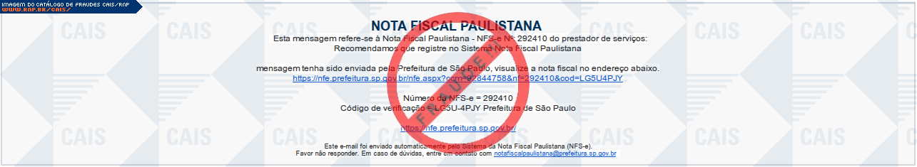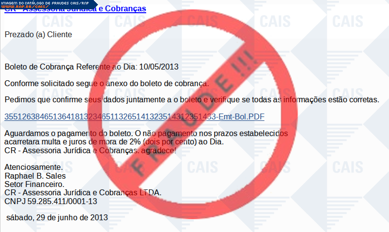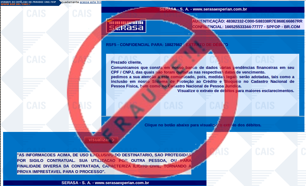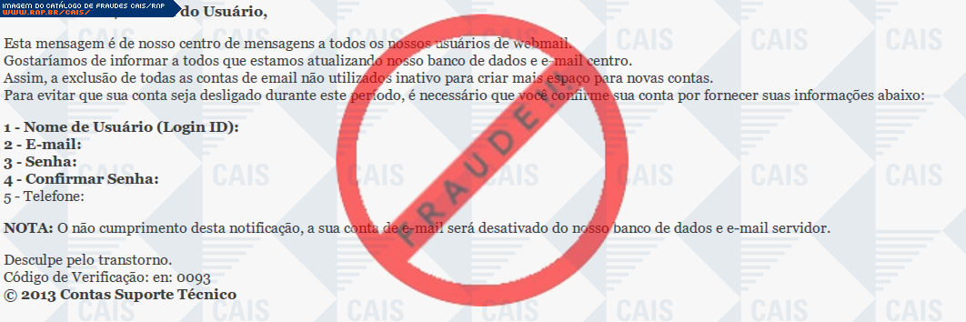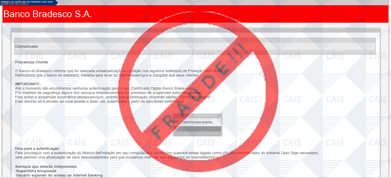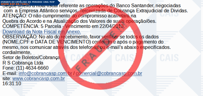 Esta página tem função informativa e educativa. Exibe uma coleção de imagens de phishing scam (fraudes eletrônicas) ou malware (código malicioso) veiculados por meio de spam (e-mail não-solicitado). Trata-se de conteúdo exemplificativo, não exaustivo, uma vez que não é possível contemplar todos os casos de fraudes existentes. Assim, caso você tenha conhecimento de um exemplar que não esteja aqui presente, isto não significa que não seja válido ou real. Inclusive incentivamos que você o envie para análise do CAIS para que, se for o caso, passe a integrar o nosso acervo.