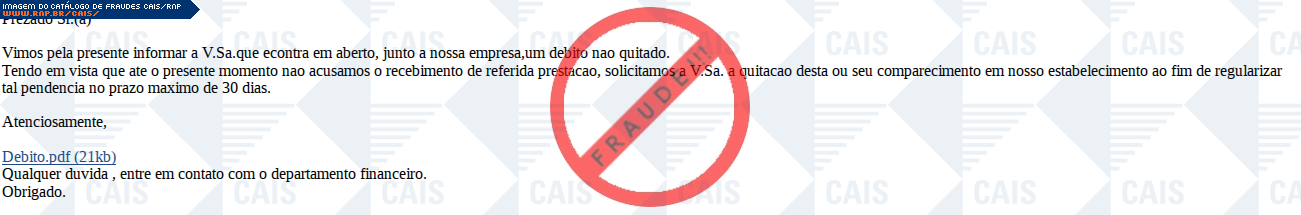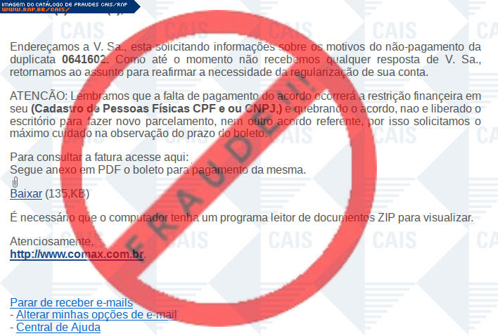 | comentário | Malware: O usuario recebe um email afirmando que existe um debito pendete e que segue em anexo boleto para pagamento, porém trata-se de um link para download de um malware. | |