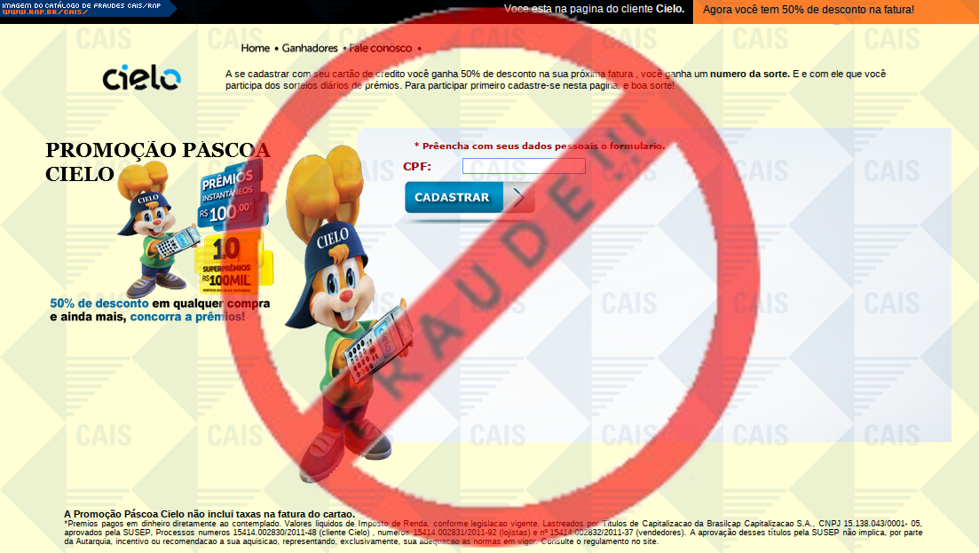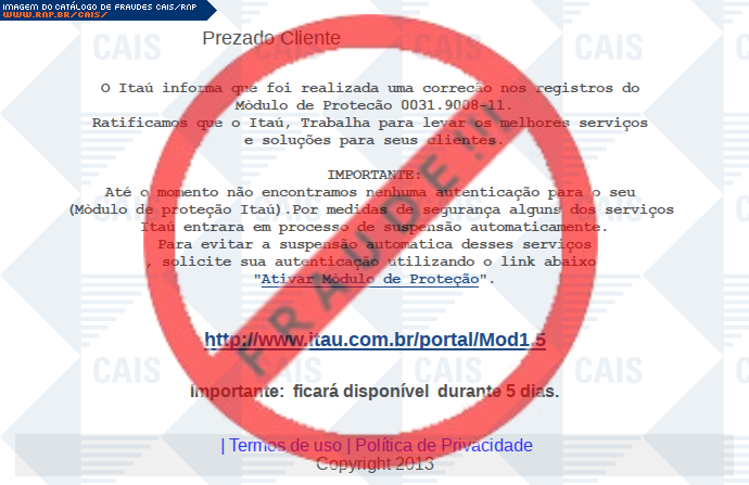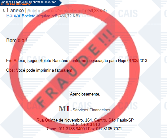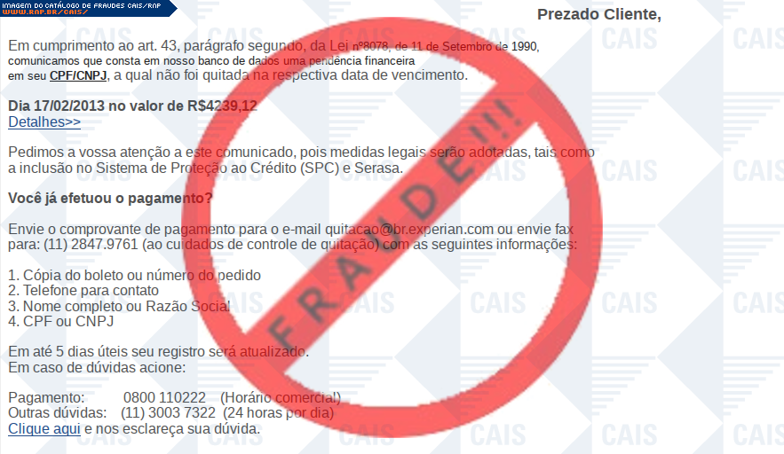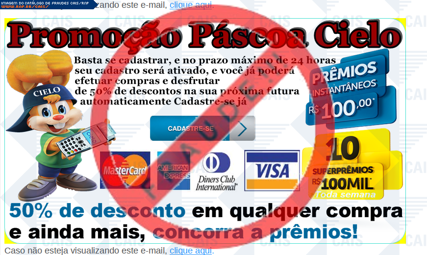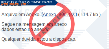 Esta página tem função informativa e educativa. Exibe uma coleção de imagens de phishing scam (fraudes eletrônicas) ou malware (código malicioso) veiculados por meio de spam (e-mail não-solicitado). Trata-se de conteúdo exemplificativo, não exaustivo, uma vez que não é possível contemplar todos os casos de fraudes existentes. Assim, caso você tenha conhecimento de um exemplar que não esteja aqui presente, isto não significa que não seja válido ou real. Inclusive incentivamos que você o envie para análise do CAIS para que, se for o caso, passe a integrar o nosso acervo.