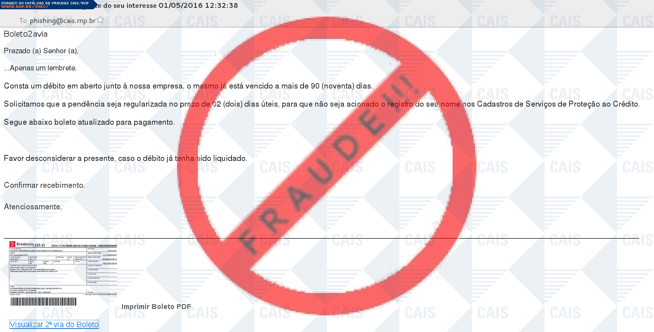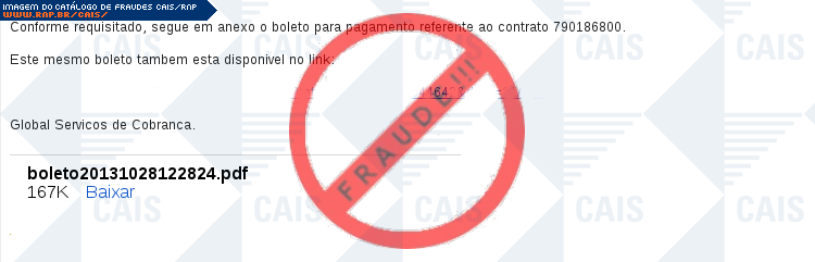 Esta página tem função informativa e educativa. Exibe uma coleção de imagens de phishing scam (fraudes eletrônicas) ou malware (código malicioso) veiculados por meio de spam (e-mail não-solicitado). Trata-se de conteúdo exemplificativo, não exaustivo, uma vez que não é possível contemplar todos os casos de fraudes existentes. Assim, caso você tenha conhecimento de um exemplar que não esteja aqui presente, isto não significa que não seja válido ou real. Inclusive incentivamos que você o envie para análise do CAIS para que, se for o caso, passe a integrar o nosso acervo.