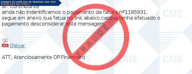 Esta página tem função informativa e educativa. Exibe uma coleção de imagens de phishing scam (fraudes eletrônicas) ou malware (código malicioso) veiculados por meio de spam (e-mail não-solicitado). Trata-se de conteúdo exemplificativo, não exaustivo, uma vez que não é possível contemplar todos os casos de fraudes existentes. Assim, caso você tenha conhecimento de um exemplar que não esteja aqui presente, isto não significa que não seja válido ou real. Inclusive incentivamos que você o envie para análise do CAIS para que, se for o caso, passe a integrar o nosso acervo.