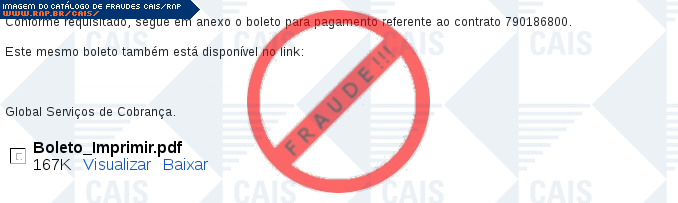 | comentário | A vítima recebe um email dizendo que em anexo há uma segunda via de um suposto boleto. Porém, o anexo leva ao download de um malware de nome Gen:Variant.Graftor.250106 que tenta infectar o computador da vítima. | |
