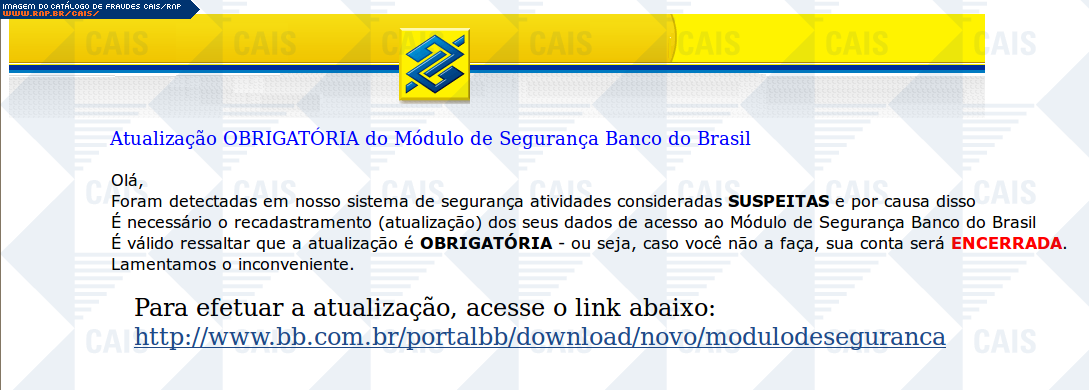 | comentário | A mensagem, em nome do Banco do Brasil, tenta aliciar a vítima a realizar uma suposta atualização obrigatória do módulo de segurança. O link para a atualização leva a conteúdo malicioso que não estava mais disponível no momento da análise. | |