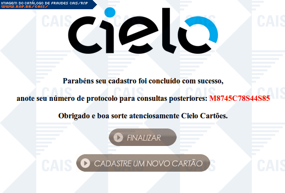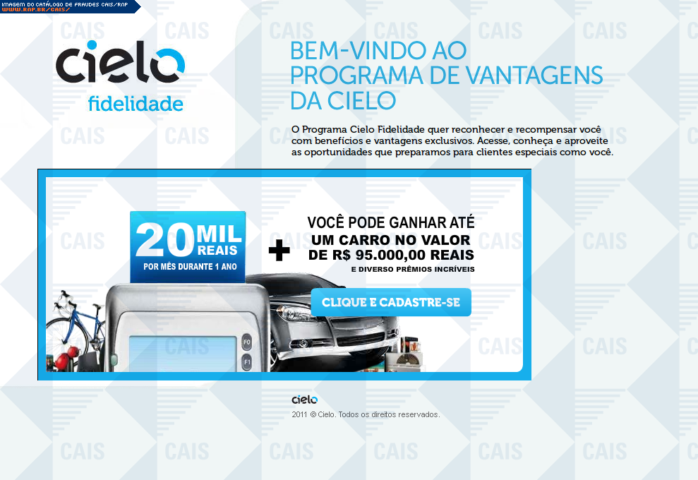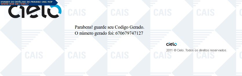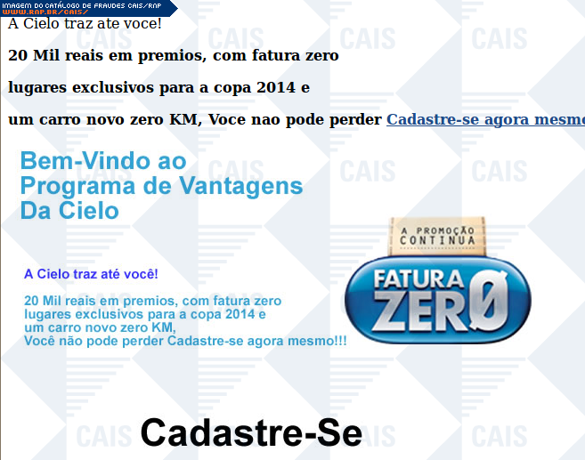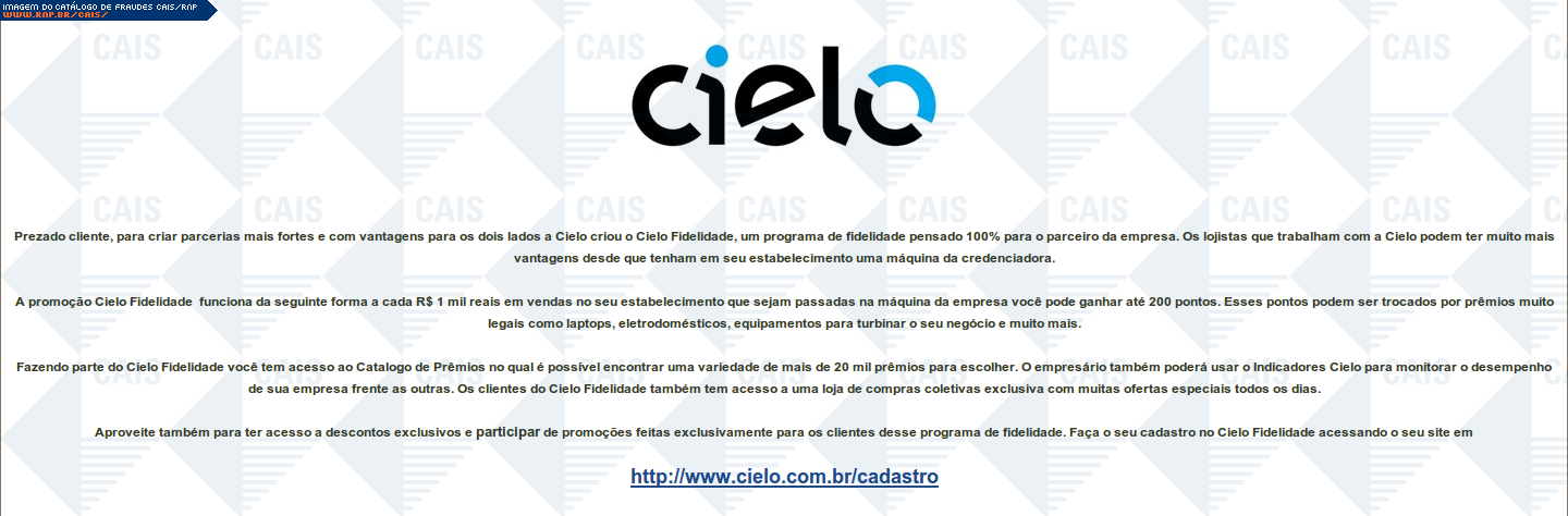 | comentário | A fraude contém um link para o cadastro em uma promoção da Cielo. O link leva a conteúdo malicioso que não estava mais disponível no momento da análise. | |