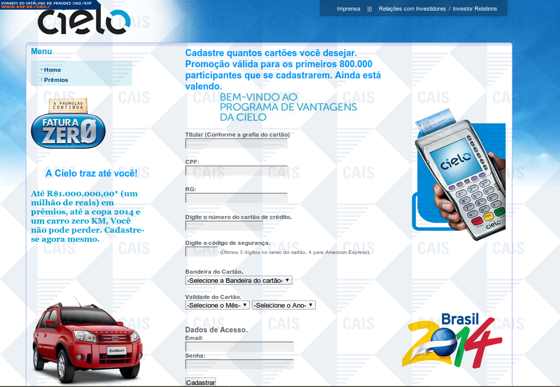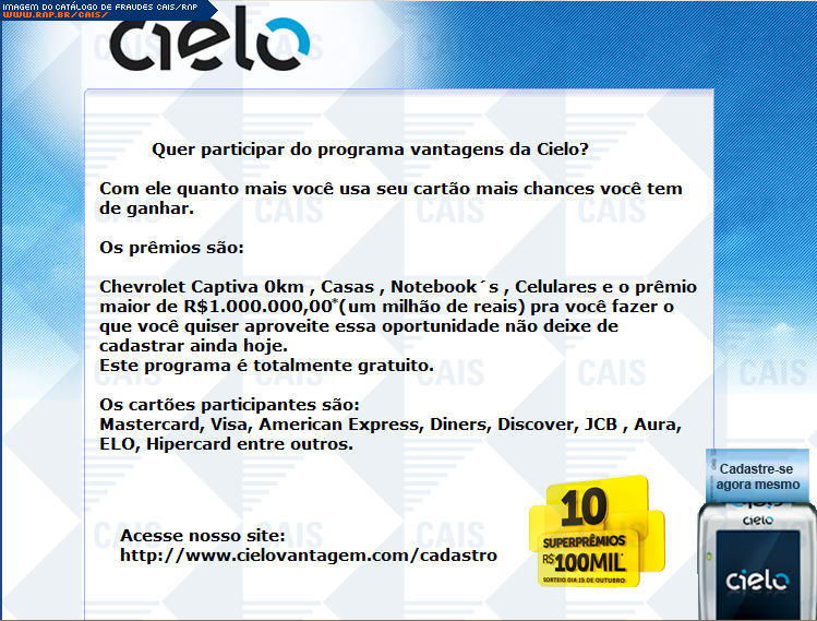| comentário | Mensagem falsa em nome da Cielo contendo um link para o cadastro em uma promoção. O link leva a um site falso, destinado a coletar dados da conta bancária da vítima. | |