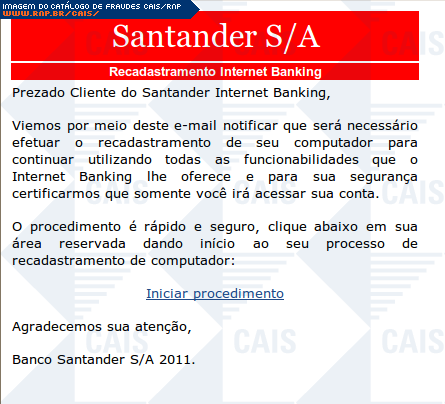 | comentário | A mensagem, em nome do banco Santander, contém um link para que a vítima recadastre seu computador. O link leva a um software malicioso que foi identificado como Trojan-Banker.Win32.Banbra (Ikarus). | |