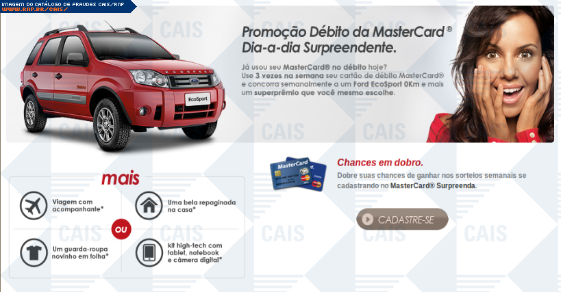 | comentário | A fraude tenta aliciar a vítima a se cadastrar em uma promoção da Mastercard através de um link. O conteúdo malicioso não estava mais disponível. | |