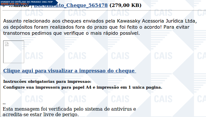 | comentário | A mensagem se passa pelo envio do comprovate do depósito de cheques pela Kawasaky Acessoria Jurídica Ltda. O conteúdo malicioso não estava disponível no momento da análise. | |