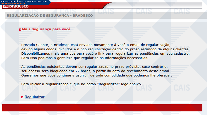 | comentário | Comunicado falso em nome do banco Bradesco informando que a vítima deve realizar uma suposta regularização. O link leva a conteúdo malicioso que já havia sido removido no momento da análise. | |