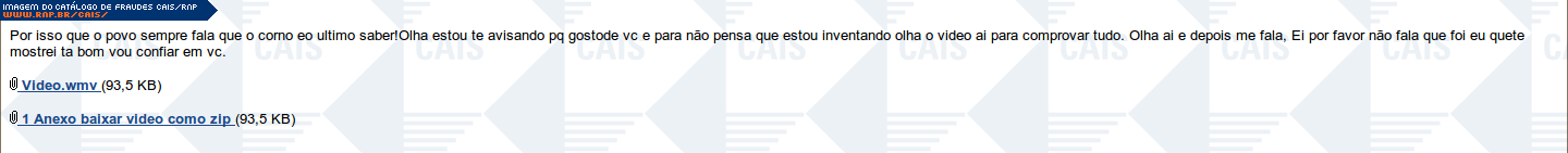 | comentário | A mensagem, que teria sido enviada por um amigo da vítima, contém um link pra um suposto vídeo que prova que a vítima está sendo traída. O conteúdo malicioso não estava disponível no momento da análise. | |