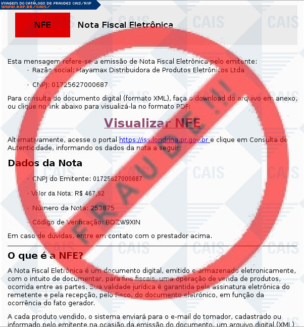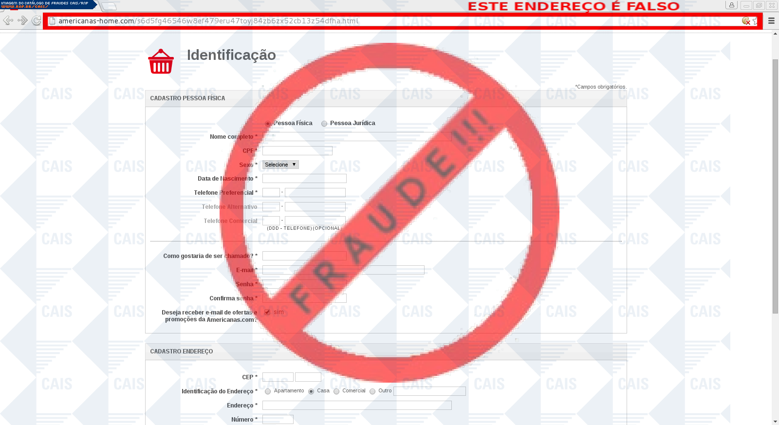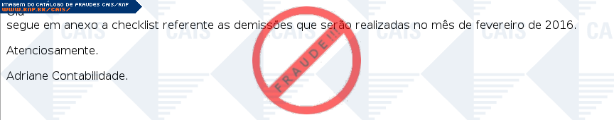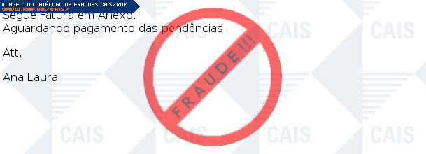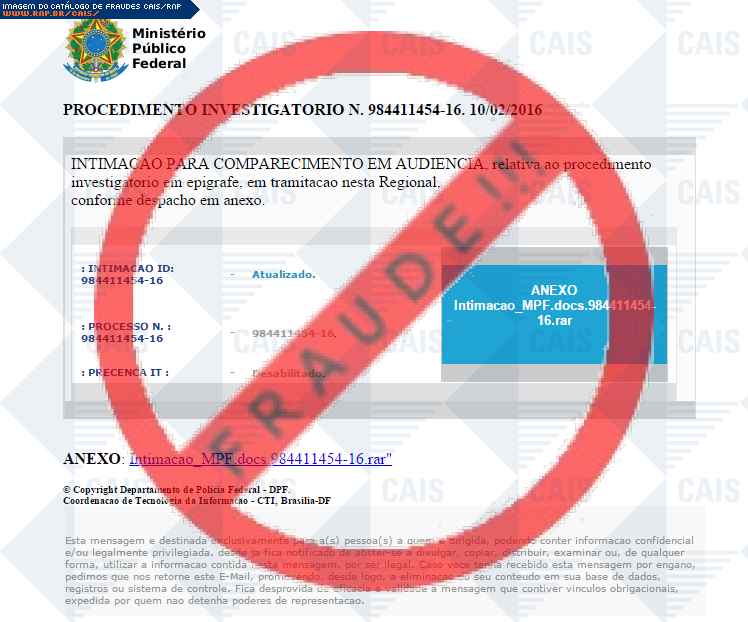 Esta página tem função informativa e educativa. Exibe uma coleção de imagens de phishing scam (fraudes eletrônicas) ou malware (código malicioso) veiculados por meio de spam (e-mail não-solicitado). Trata-se de conteúdo exemplificativo, não exaustivo, uma vez que não é possível contemplar todos os casos de fraudes existentes. Assim, caso você tenha conhecimento de um exemplar que não esteja aqui presente, isto não significa que não seja válido ou real. Inclusive incentivamos que você o envie para análise do CAIS para que, se for o caso, passe a integrar o nosso acervo.