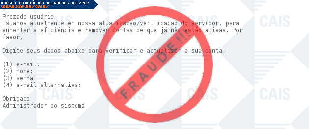 | comentário | A vítima recebe um email dizendo que devido a uma atualização no servidor é necessário fazer uma verificação de sua conta de email. Entretanto essa é uma mensagem falsa que tenta roubar os dados de email da vítima. | |