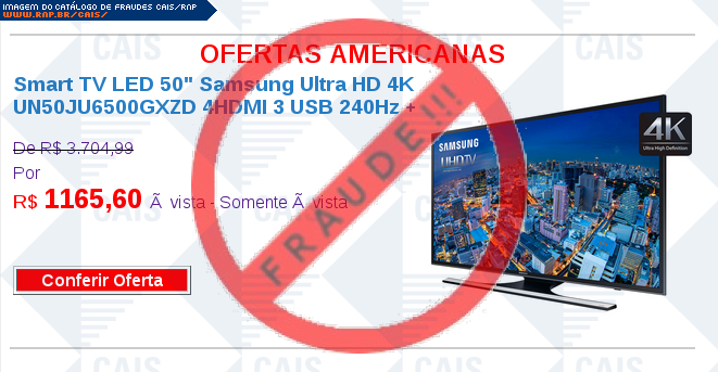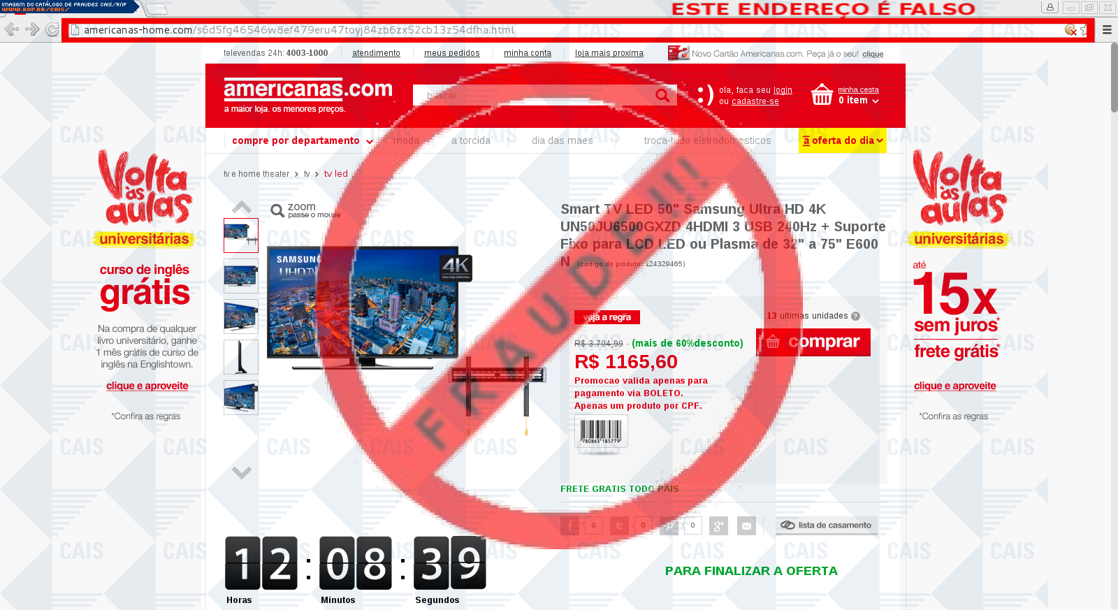 | comentário | A vítima recebe um e-mail informando sobre promoções no site de compra da Loja Americanas disponibilizando link de oferta de TV, no entanto a página é falsa destinada a roubar as informações pessoais e do cartão de crédito/débito do usuário. | |