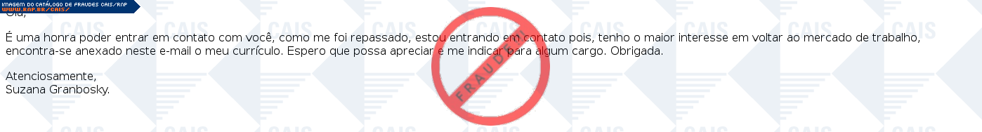 | comentário | O usuário recebe uma mensagem contendo um currículo de uma pessoa que deseja voltar para o mercado de trabalho disponível para download, no entanto o arquivo originado é malicioso criado para roubar informações da vítima e instalar outros arquivos fraudulentos... (leia mais) | |