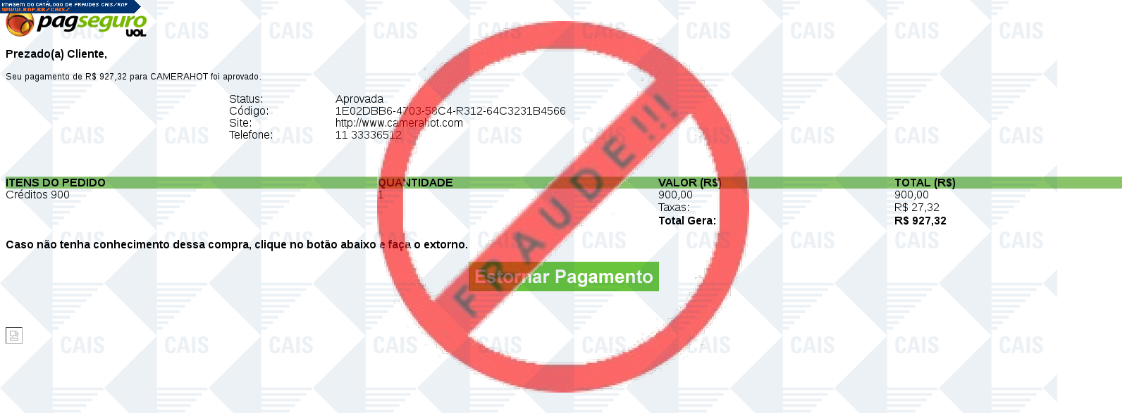 | comentário | A vítima recebe um e-mail em nome do Pagseguro dizendo que um pagamento de R$900,00 foi aprovado para um site e passa um link para estornar o pagamento. Entretanto o link na mensagem leva a um site falso que tenta roubar as credenciais de acesso do Pagseguro... (leia mais) | |