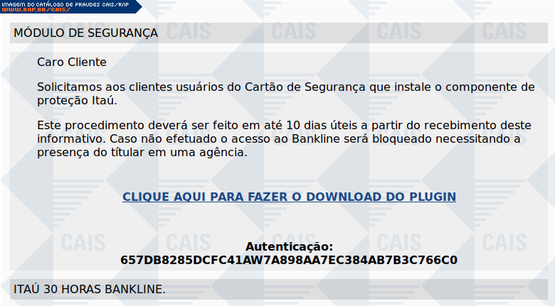 | comentário | Mensagem que solicita à vítima para fazer uma atualização de segurança. É disponibilizado um link que contêm um código malicioso nomeado sugestivamente como: Módulo de Segurança Itaú 5.6.0.2 e identificado como o software malicioso: a variant of Win32/Spy.Banker.VIT... (leia mais) | |