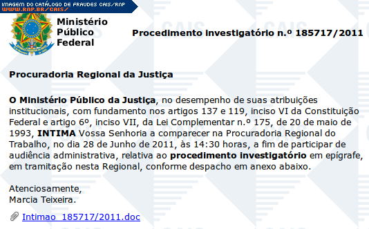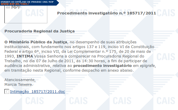 | comentário | Mensagem se passando pela Procuradoria Regional da Justiça e que intima a vítima a comparecer em uma procuradoria regional. Na mensagem há um link com a suposta intimação que na verdade é um código malicioso identificado como: Trojan-Downloader.Win32.Banload.blrb... (leia mais) | |