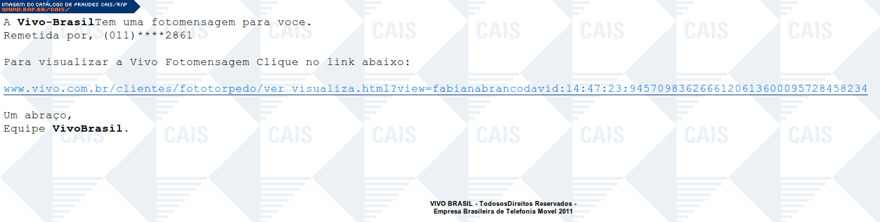 | comentário | Mensagem que carrega uma suposta fotomensagem. A fraude possui erros grosseiros como por exemplo, o From (de) estar como Visa Brasil e não relacionada à Vivo. O link na mensagem direciona para um código malicioso identificado como:PWS-Banker.gen.em (McAfee).... (leia mais) | |