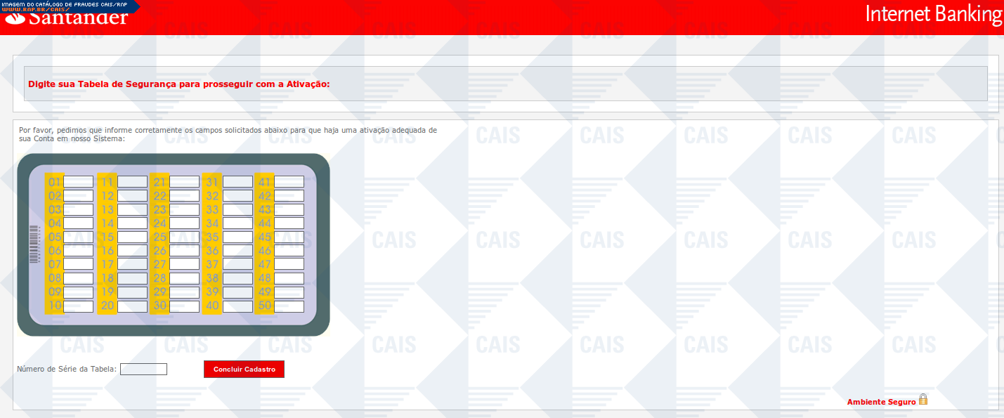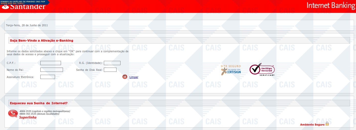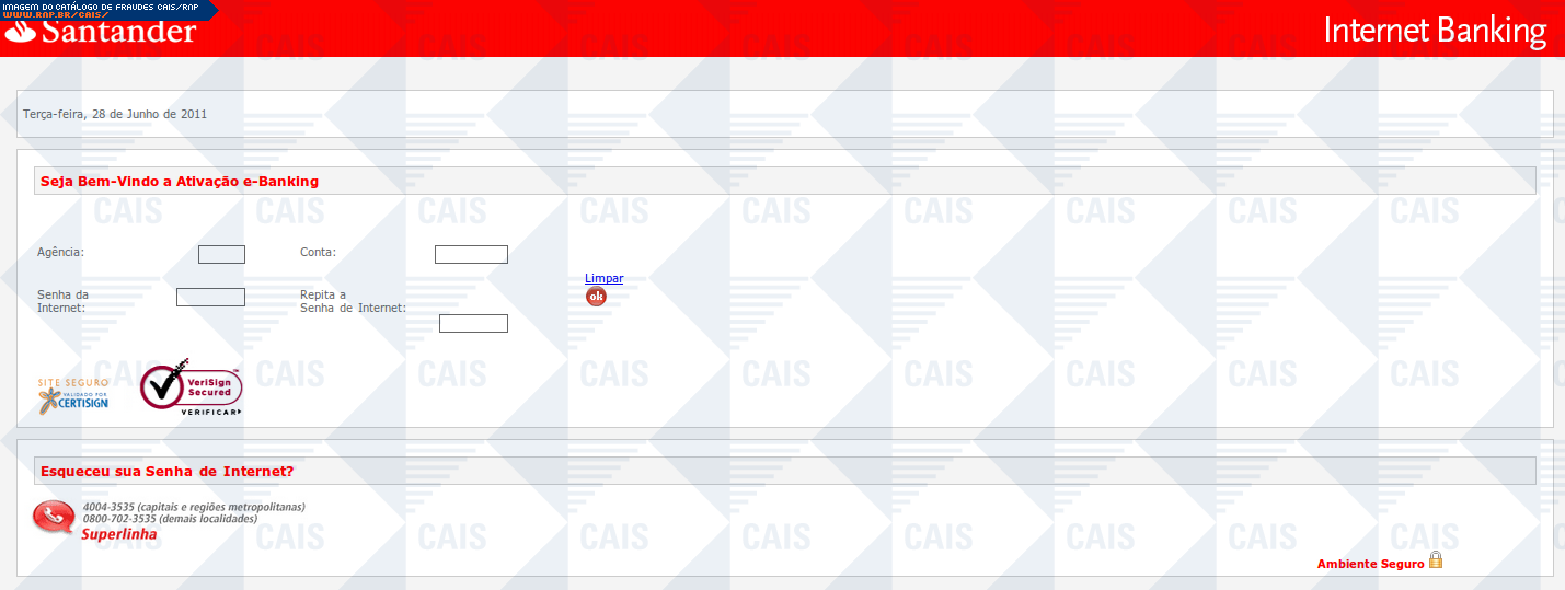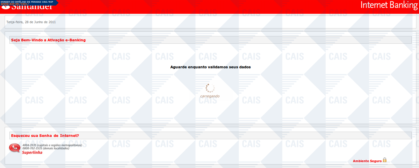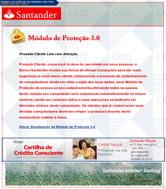 | comentário | Mensagem que diz à vítima para instalar um módulo de atualização. Esse módulo estaria supostamente na versão 3.0. O link direciona para várias páginas onde o usuário deve inserir todos os seus dados bancários do Santander. Esses dados incluem, todas as senhas... (leia mais) | |