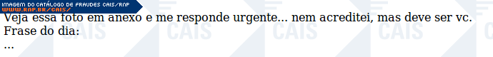 | comentário | A mensagem, que teria sido enviada por amigo da vítima, se passa pelo envio de uma foto. O conteúdo malicioso não estava disponível no momento da análise. | |