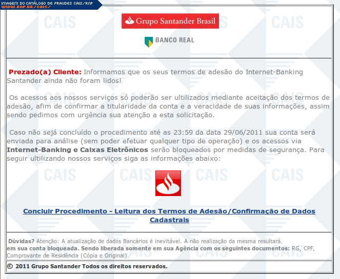 | assunto | Prezado Cliente Real/Santander : Comunicado de Segurança - 26/06/2011 | |