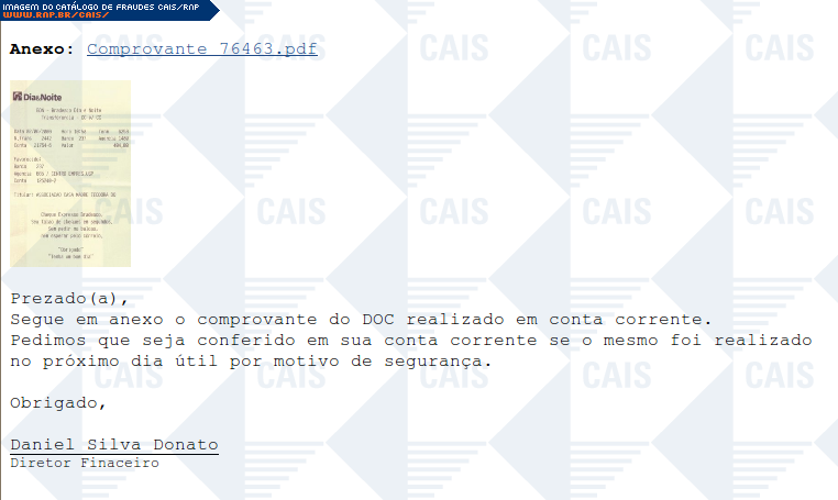 Esta página tem função informativa e educativa. Exibe uma coleção de imagens de phishing scam (fraudes eletrônicas) ou malware (código malicioso) veiculados por meio de spam (e-mail não-solicitado). Trata-se de conteúdo exemplificativo, não exaustivo, uma vez que não é possível contemplar todos os casos de fraudes existentes. Assim, caso você tenha conhecimento de um exemplar que não esteja aqui presente, isto não significa que não seja válido ou real. Inclusive incentivamos que você o envie para análise do CAIS para que, se for o caso, passe a integrar o nosso acervo.