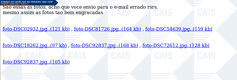 | comentário | A mensagem, que teria sido enviada por um amigo da vítima, contém links para fotos engraçadas. O conteúdo malicioso não estava disponível no momento da análise. | |