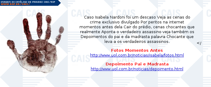 | comentário | Mais uma mensagem que tenta explorar o caso Isabella Nardoni. A mensagem anuncia fotos inéditas e usa uma imagem genérica da impressão de uma mão em cor de sangue para atrair a atenção do leitor. O malware em questão é o Banker.gen13 (F-Secure), um cavalo... (leia mais) | |