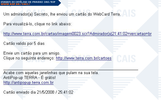 | comentário | Mais uma fraude do tipo "cartão virtual". Neste caso a mensagem fraudulenta faz referência ao portal Terra e possui link para o download do arquivo imagem0023.scr, que foi identificado por antivirus como Trojan.Downloader-37483 | |