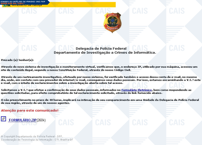 | comentário | Fraude que utiliza o nome do Departamento da Polícia Federal informando sobre atividades ilícitas que fora identificadas com origem no IP da vítima. A mensagem possui um link para o arquivo malicioso, FORMULARIO.zip, que foi identificado por antivirus como... (leia mais) | |