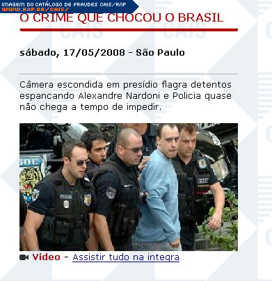 | comentário | Mais uma fraude que utiliza a tragédia da menina Isabella, desta vez noticiando o espancamento de Alexandre Nardoni na prisao. O link presente na mensagem faz download do arquivo malicioso Video.exe. | |