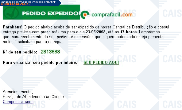 | comentário | Fraude que utiliza o nome do site CompraFacil informando sobre um pedido que foi expedido, induzindo a vítima a clicar no link "visualizar pedido" que está atrelado a um arquivo malicioso, pedido.exe. | |