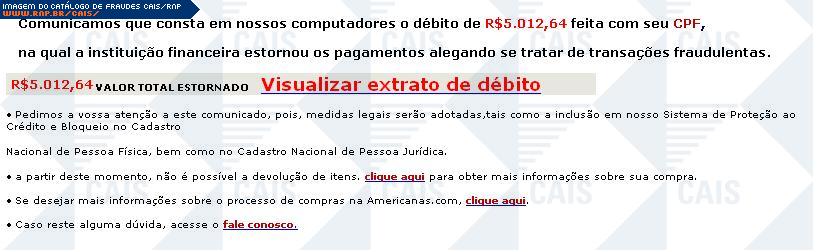 | comentário | Fraude que utiliza o nome da Americanas.com informando sobre o extorno de uma compra no valor de R$ 5.012,64. Os links maliciosos da mensagem fazem download do arquivo Extrato.ExE que foi identificado por antivirus como Backdoor.Win32.Ciadoor.13 | |