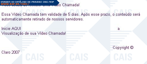 | comentário | Fraude que utiliza o nome da operadora Claro, informando sobre o envio de uma vídeo chamada 3G. A mensagem fraudulenta estava com algum defeito pois as imagens não foram carregadas corretamente. O link presente faz download do arquivo malicioso VideoChamada.exe,... (leia mais) | |
