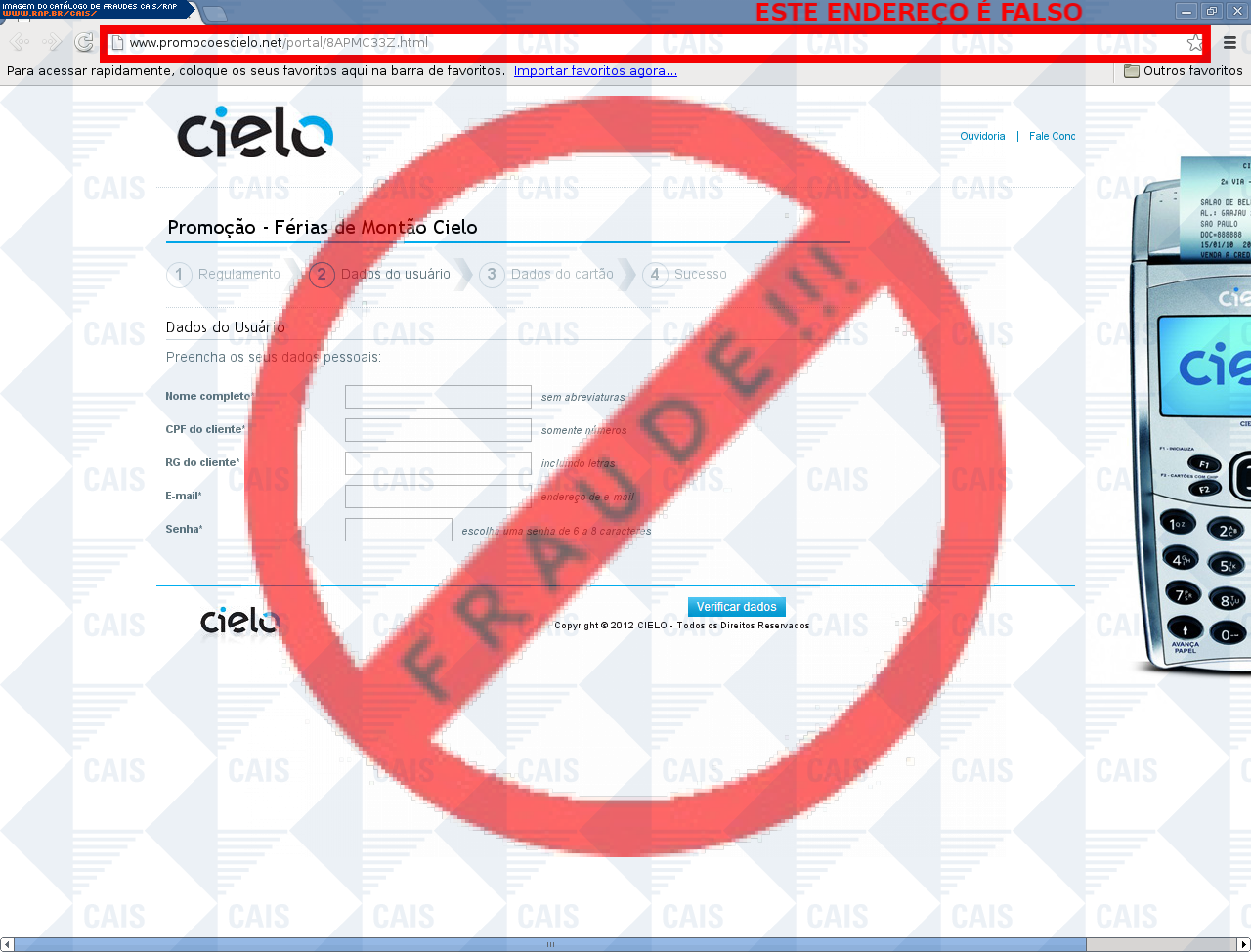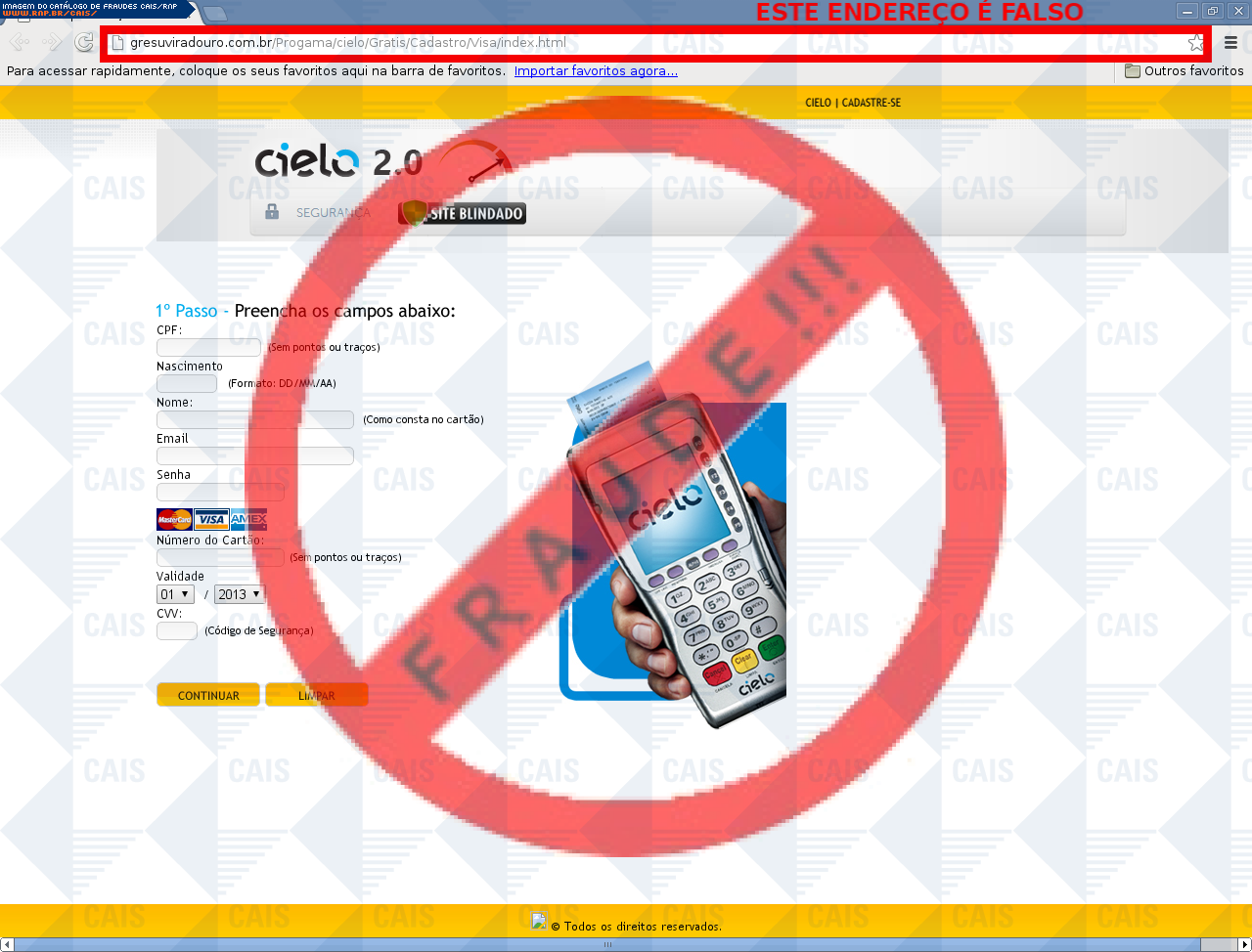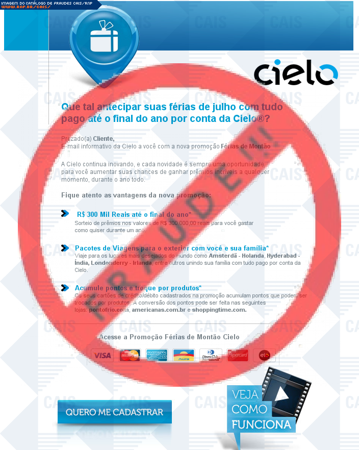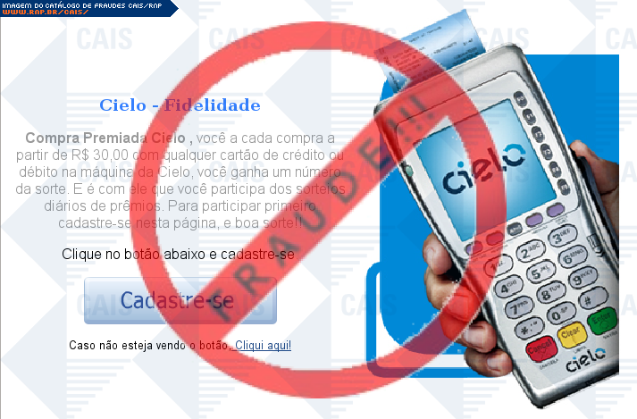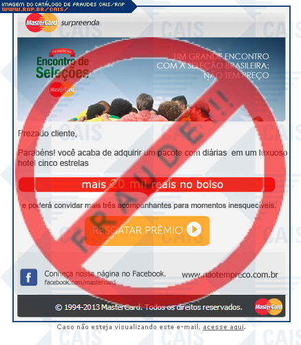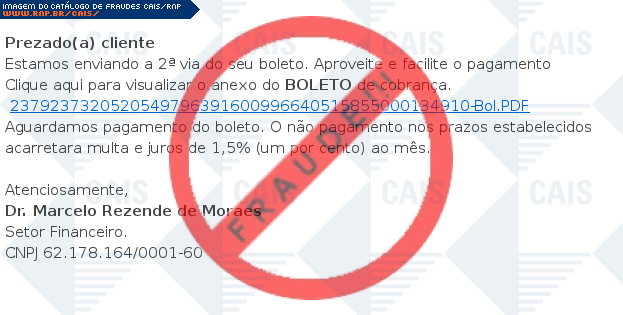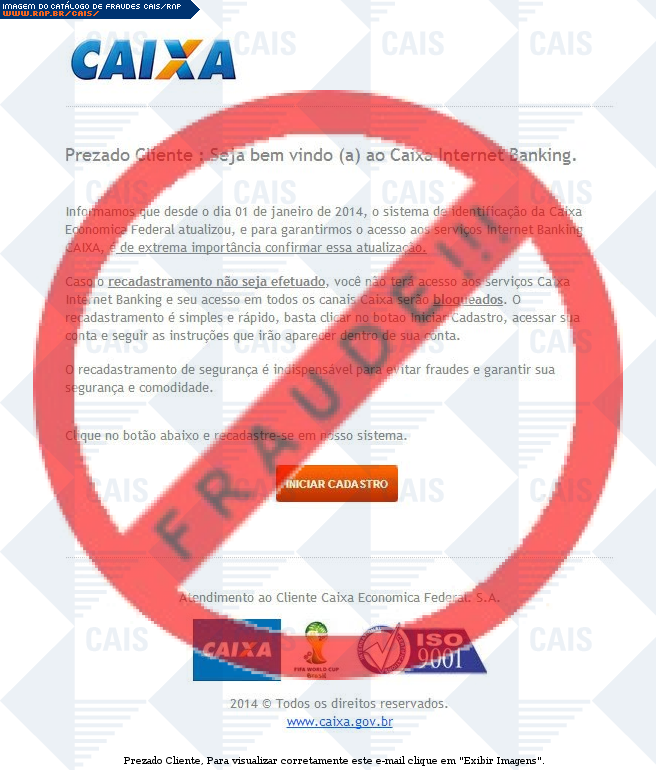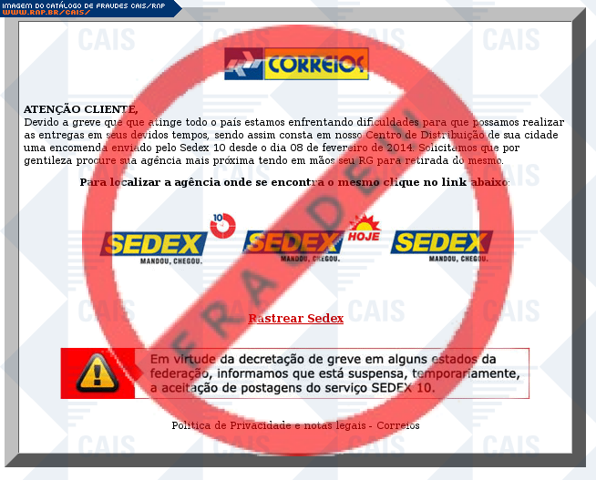 Esta página tem função informativa e educativa. Exibe uma coleção de imagens de phishing scam (fraudes eletrônicas) ou malware (código malicioso) veiculados por meio de spam (e-mail não-solicitado). Trata-se de conteúdo exemplificativo, não exaustivo, uma vez que não é possível contemplar todos os casos de fraudes existentes. Assim, caso você tenha conhecimento de um exemplar que não esteja aqui presente, isto não significa que não seja válido ou real. Inclusive incentivamos que você o envie para análise do CAIS para que, se for o caso, passe a integrar o nosso acervo.