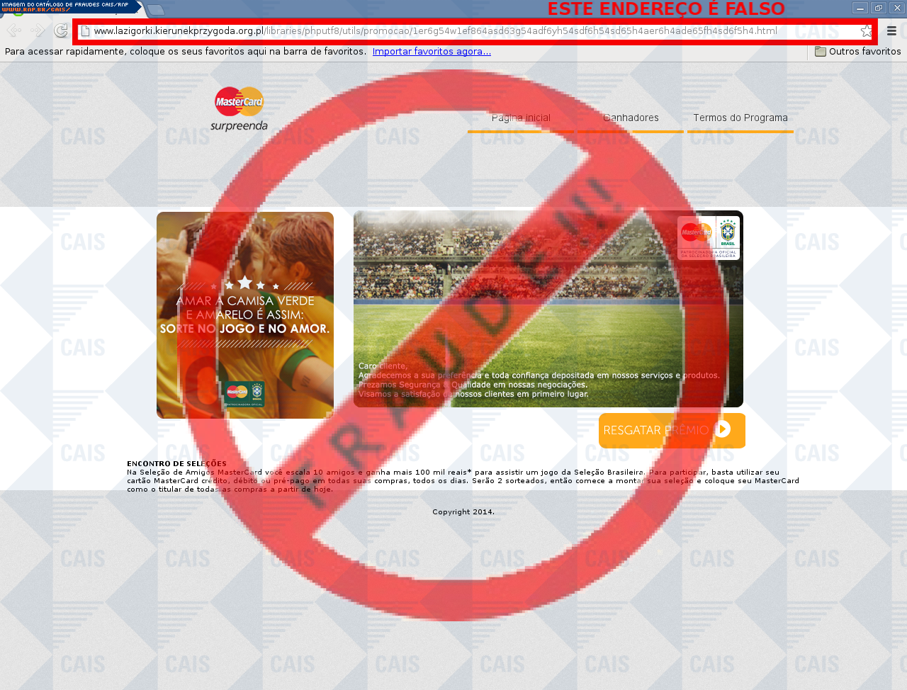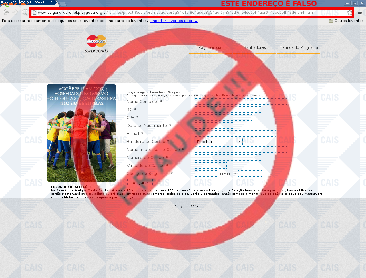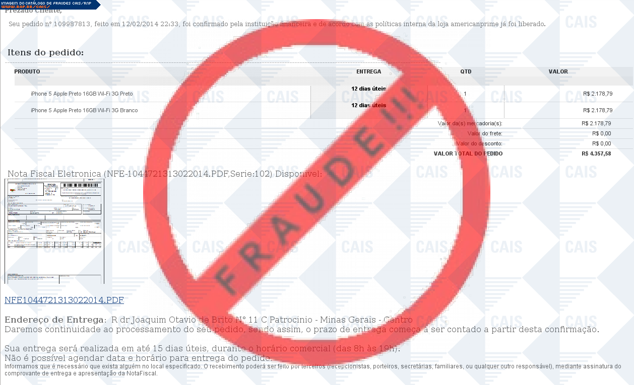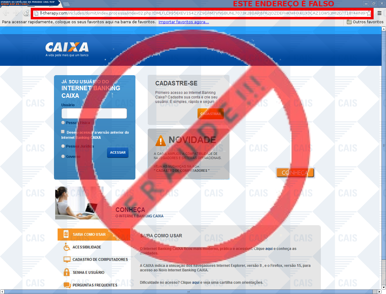 Esta página tem função informativa e educativa. Exibe uma coleção de imagens de phishing scam (fraudes eletrônicas) ou malware (código malicioso) veiculados por meio de spam (e-mail não-solicitado). Trata-se de conteúdo exemplificativo, não exaustivo, uma vez que não é possível contemplar todos os casos de fraudes existentes. Assim, caso você tenha conhecimento de um exemplar que não esteja aqui presente, isto não significa que não seja válido ou real. Inclusive incentivamos que você o envie para análise do CAIS para que, se for o caso, passe a integrar o nosso acervo.