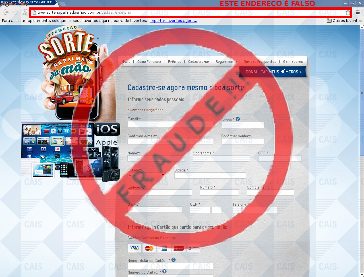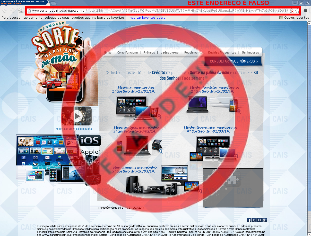 | comentário | A vítima recebe uma mensagem, informando sobre uma promoção, para participar dos sorteios diários de prêmios. Mas ao clicar no link para se cadastrar, a vítima é direcionada para uma página falsa, que é diferente da página original. | |