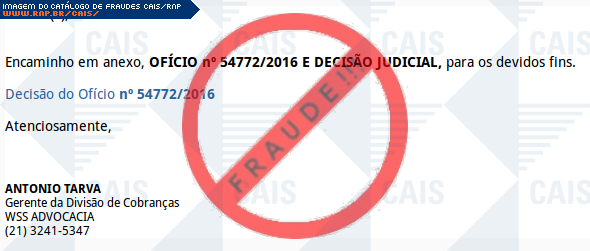 Esta página tem função informativa e educativa. Exibe uma coleção de imagens de phishing scam (fraudes eletrônicas) ou malware (código malicioso) veiculados por meio de spam (e-mail não-solicitado). Trata-se de conteúdo exemplificativo, não exaustivo, uma vez que não é possível contemplar todos os casos de fraudes existentes. Assim, caso você tenha conhecimento de um exemplar que não esteja aqui presente, isto não significa que não seja válido ou real. Inclusive incentivamos que você o envie para análise do CAIS para que, se for o caso, passe a integrar o nosso acervo.