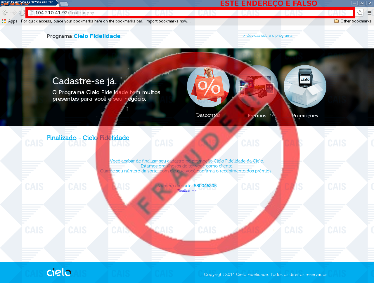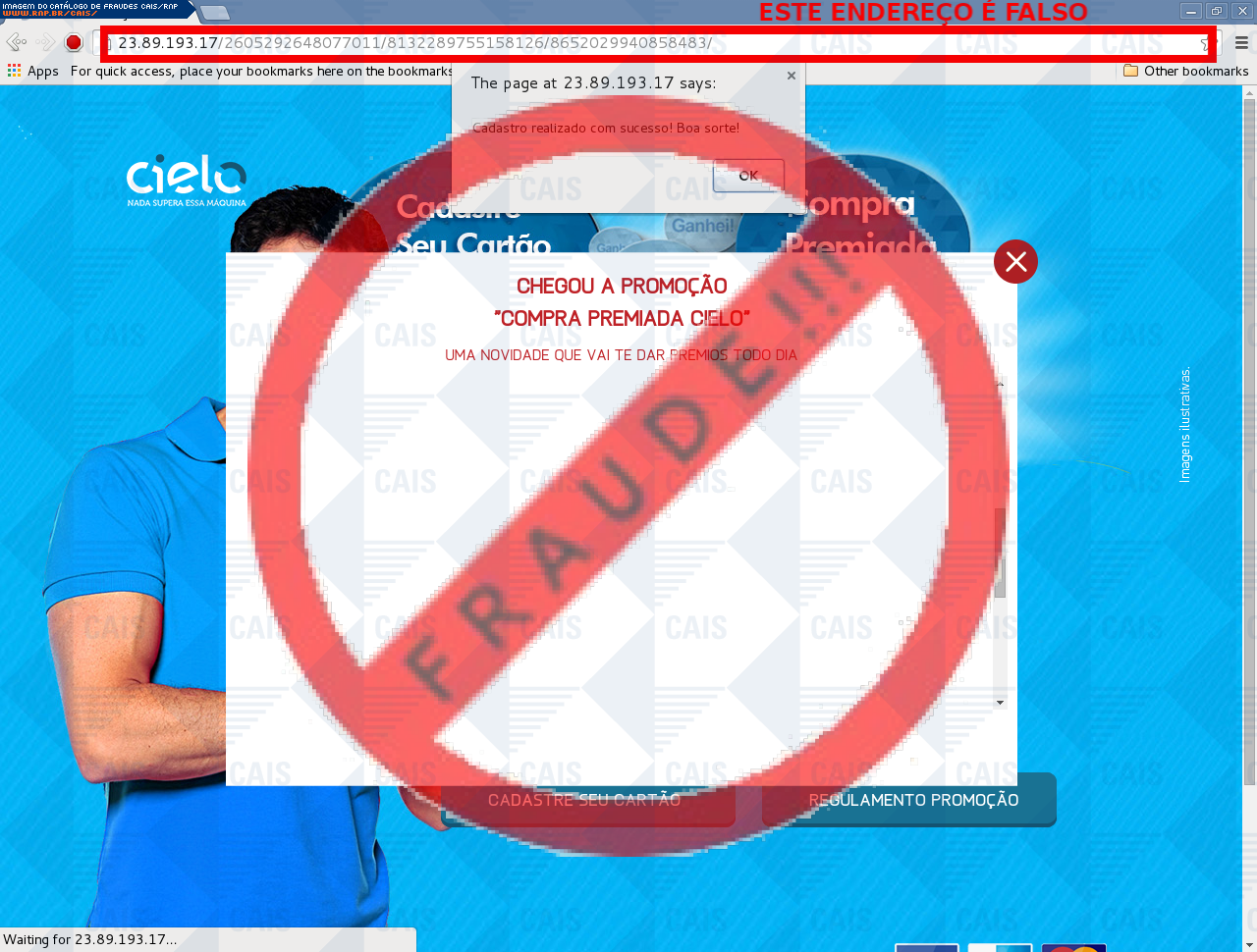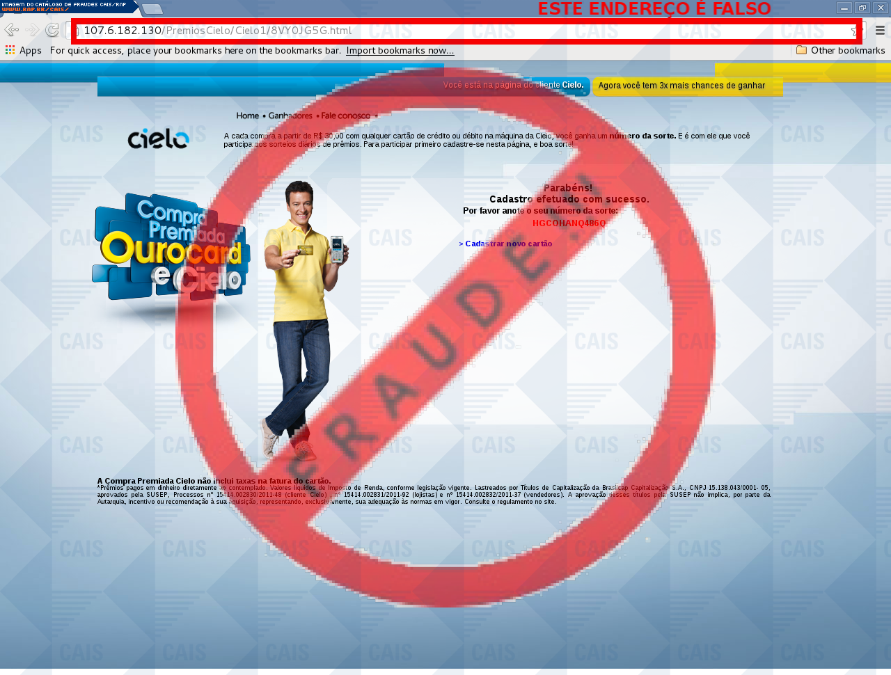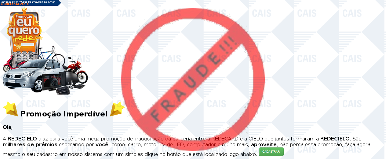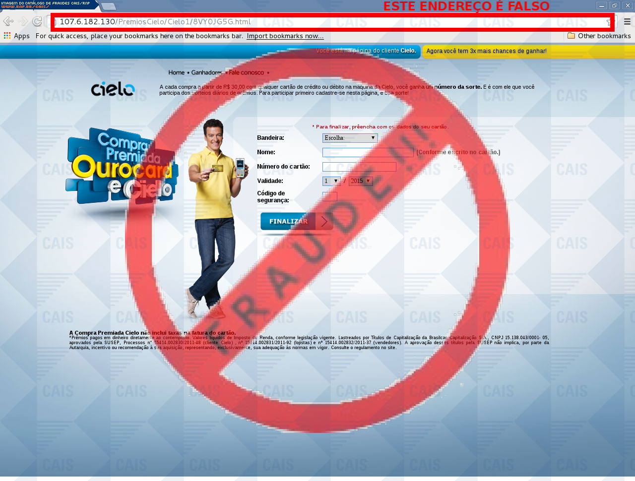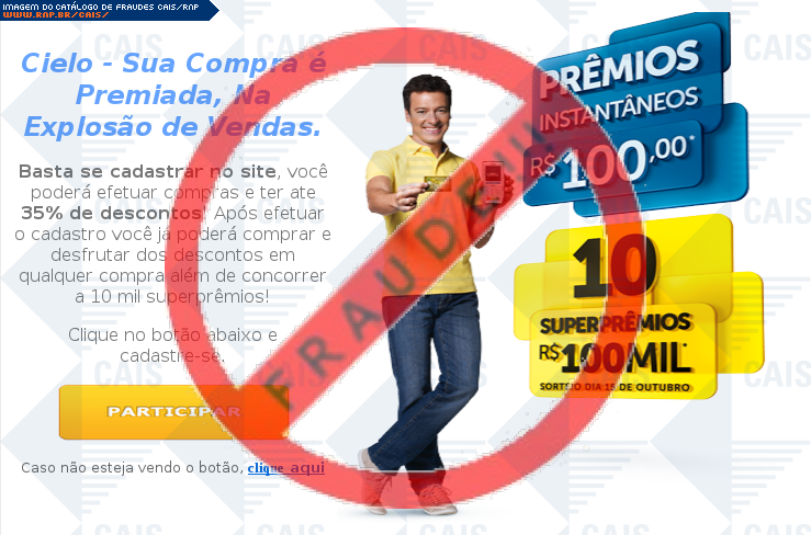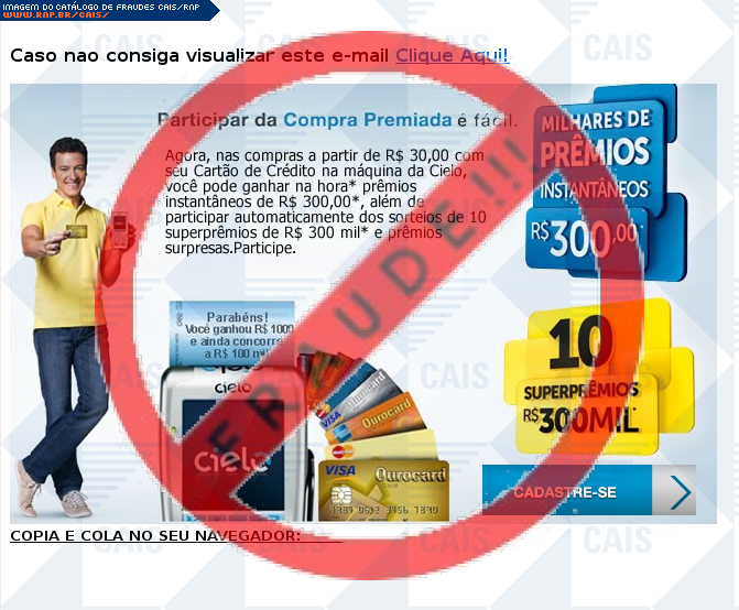 | comentário | A vítima recebe um e-mail informando sobre a promoção Compra Premiada relacionada a seu cartão Cielo sendo necessário realizar um cadastro, no entanto a página é falsa destinada a roubar os dados do cartão de crédito do usuário. | |