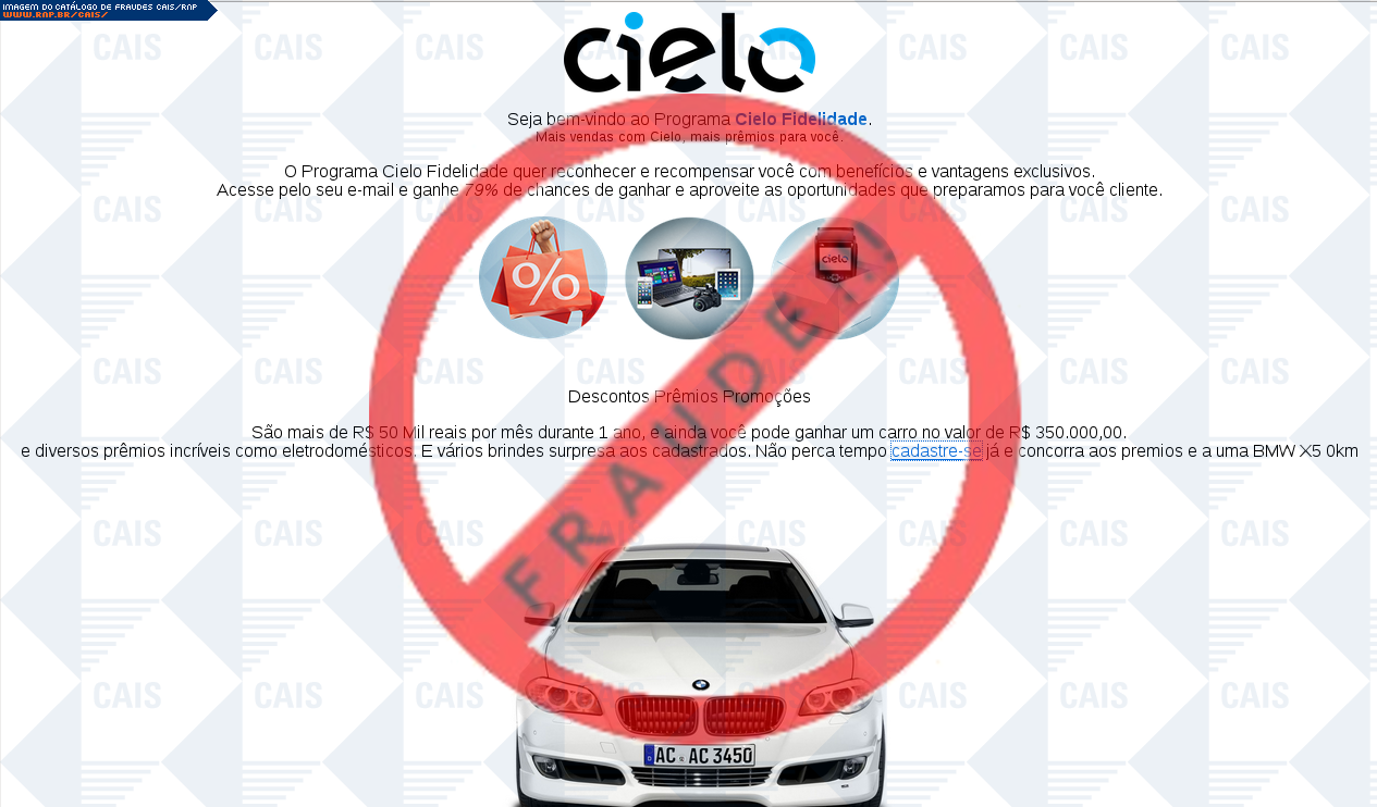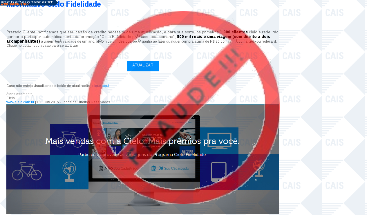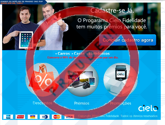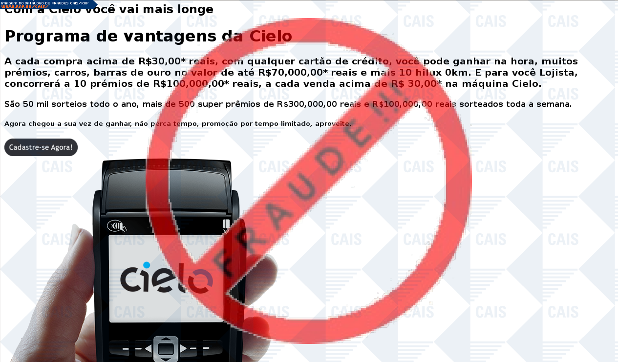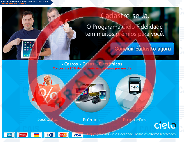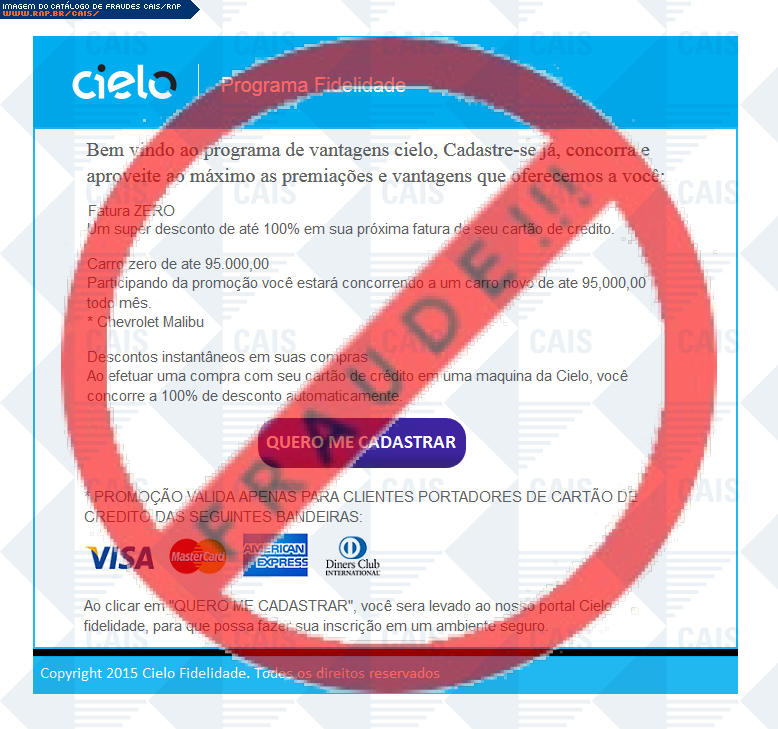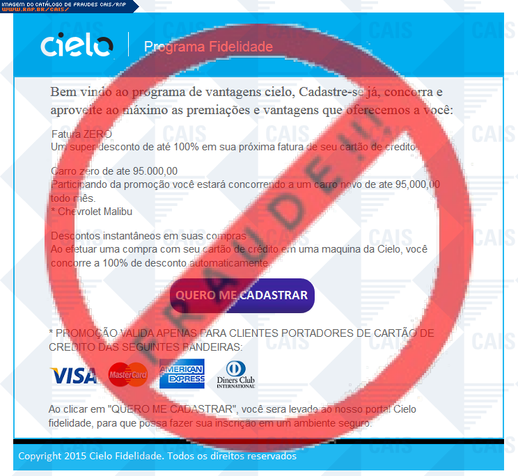 | comentário | A vítima recebe um e-mail informando sobre o programa de vantagens do cartão Cielo sendo necessário realizar um cadastro no link indicado para participar, no entanto a página é falsa destinada a roubar os dados do cartão de crédito do usuário. | |