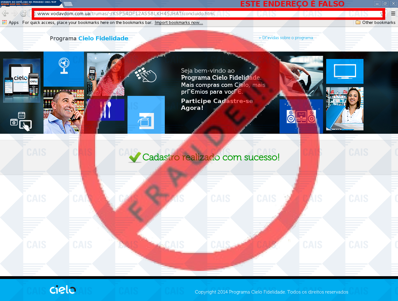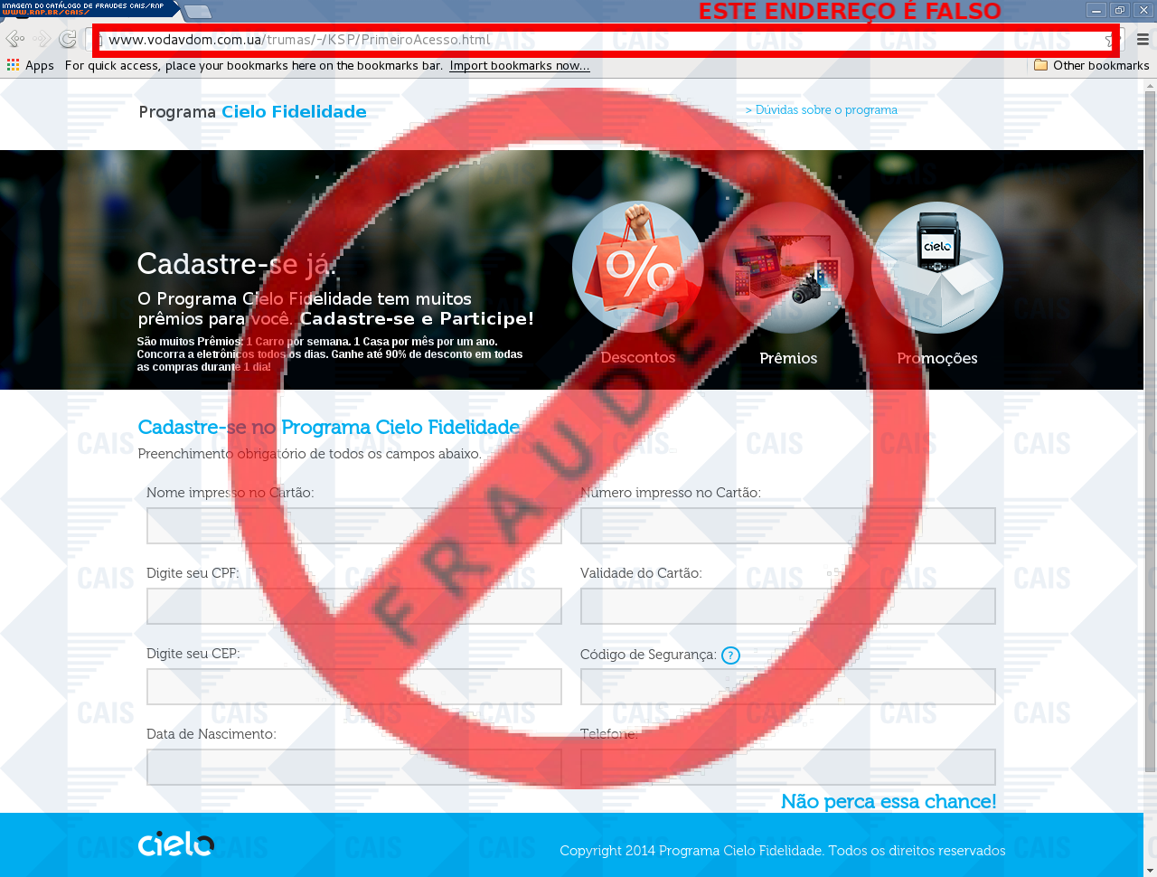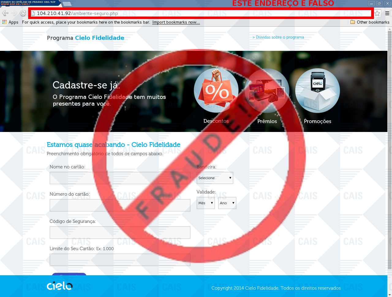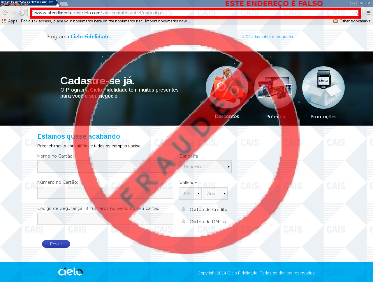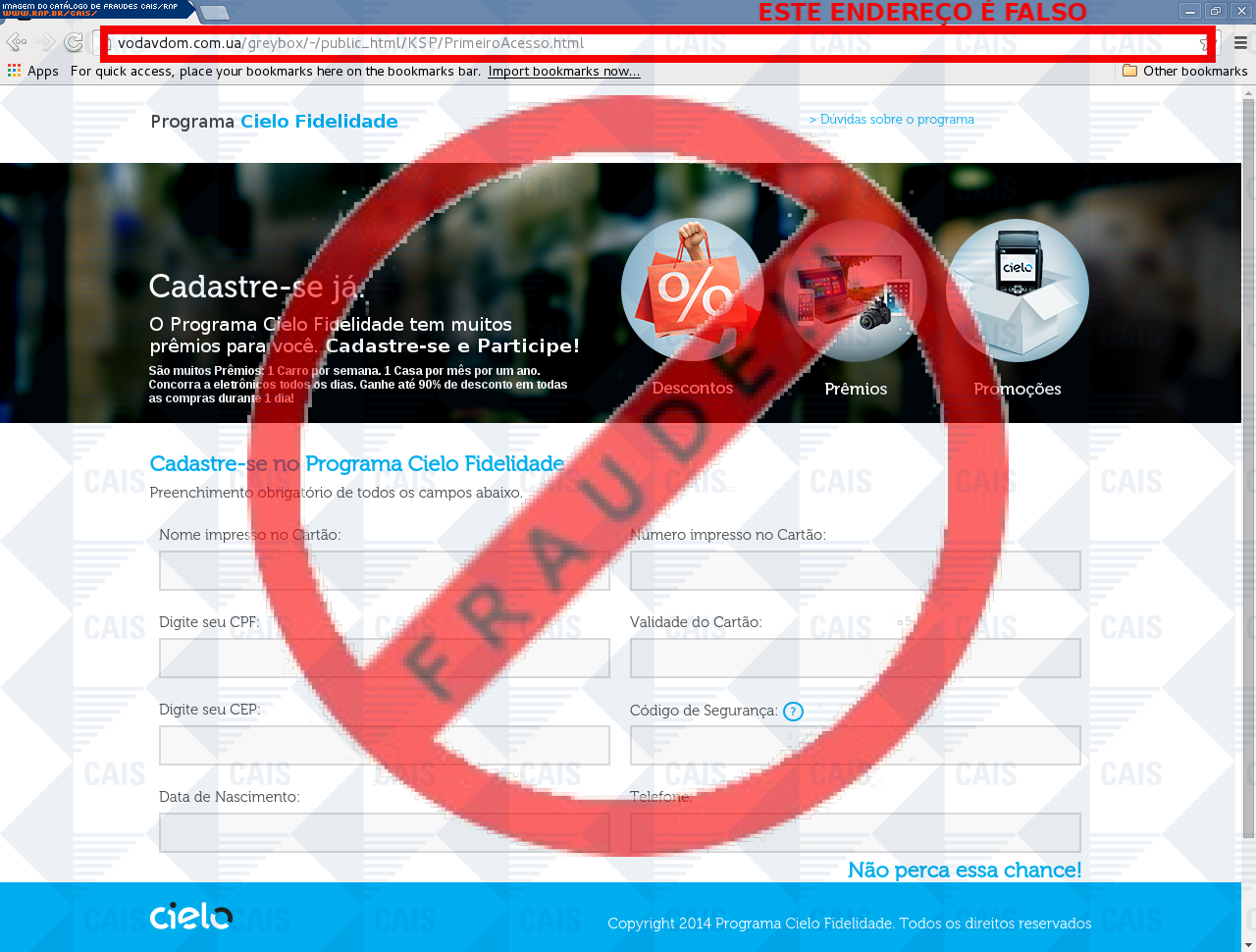 | comentário | A vítima recebe um e-mail informando sobre o programa de vantagens do cartão Cielo sendo necessário realizar um cadastro no link indicado para participar, no entanto a página é falsa destinada a roubar os dados do cartão de crédito do usuário. | |