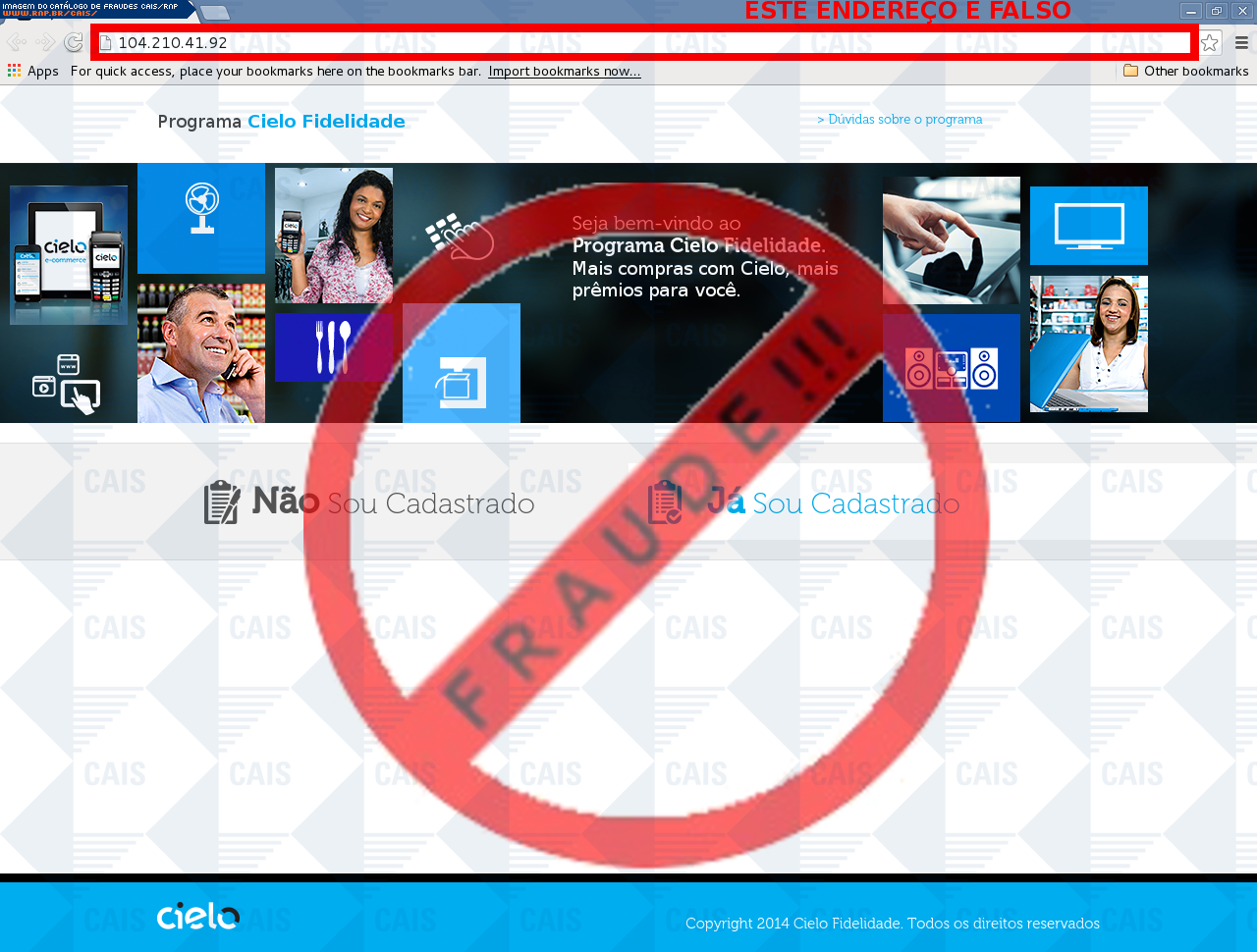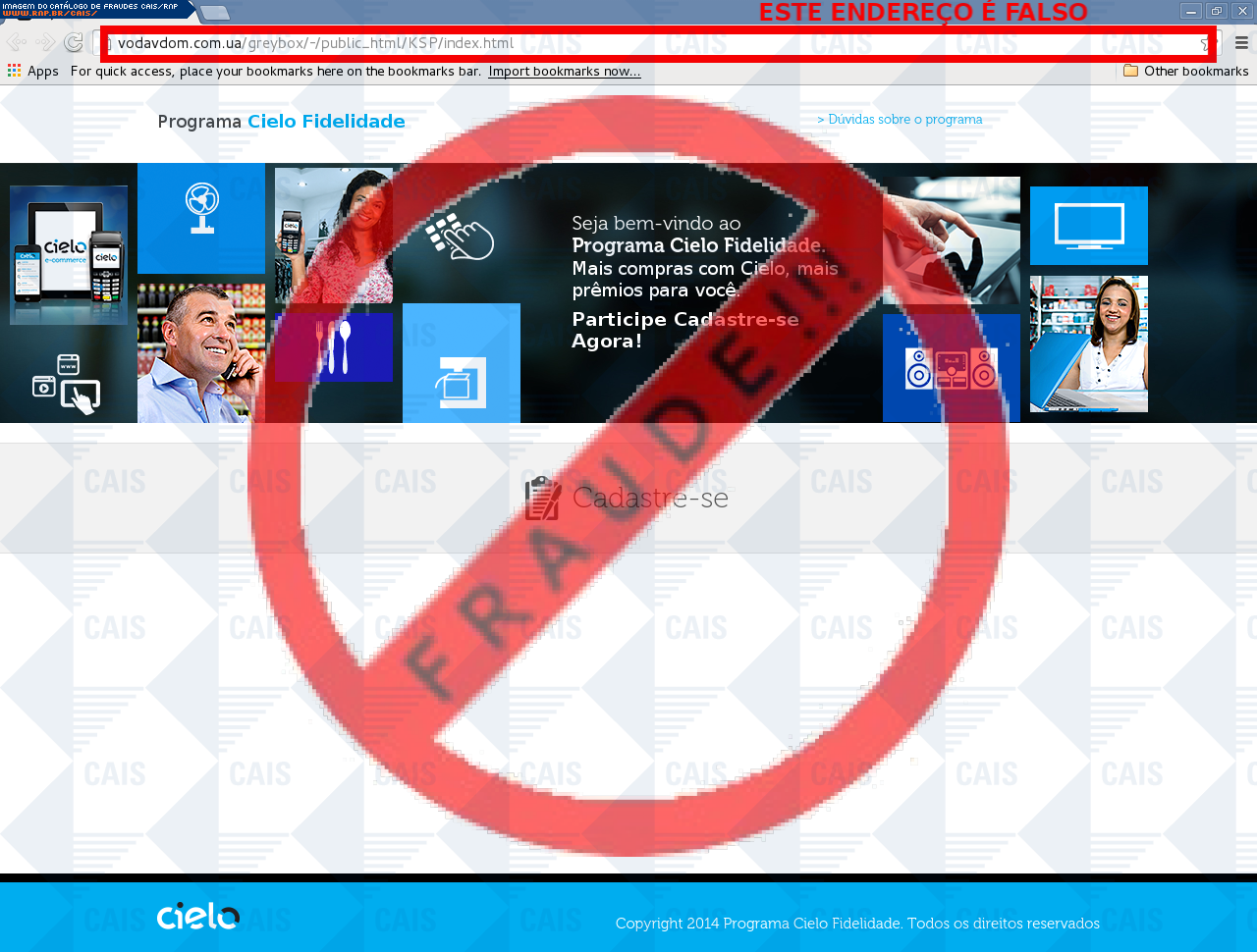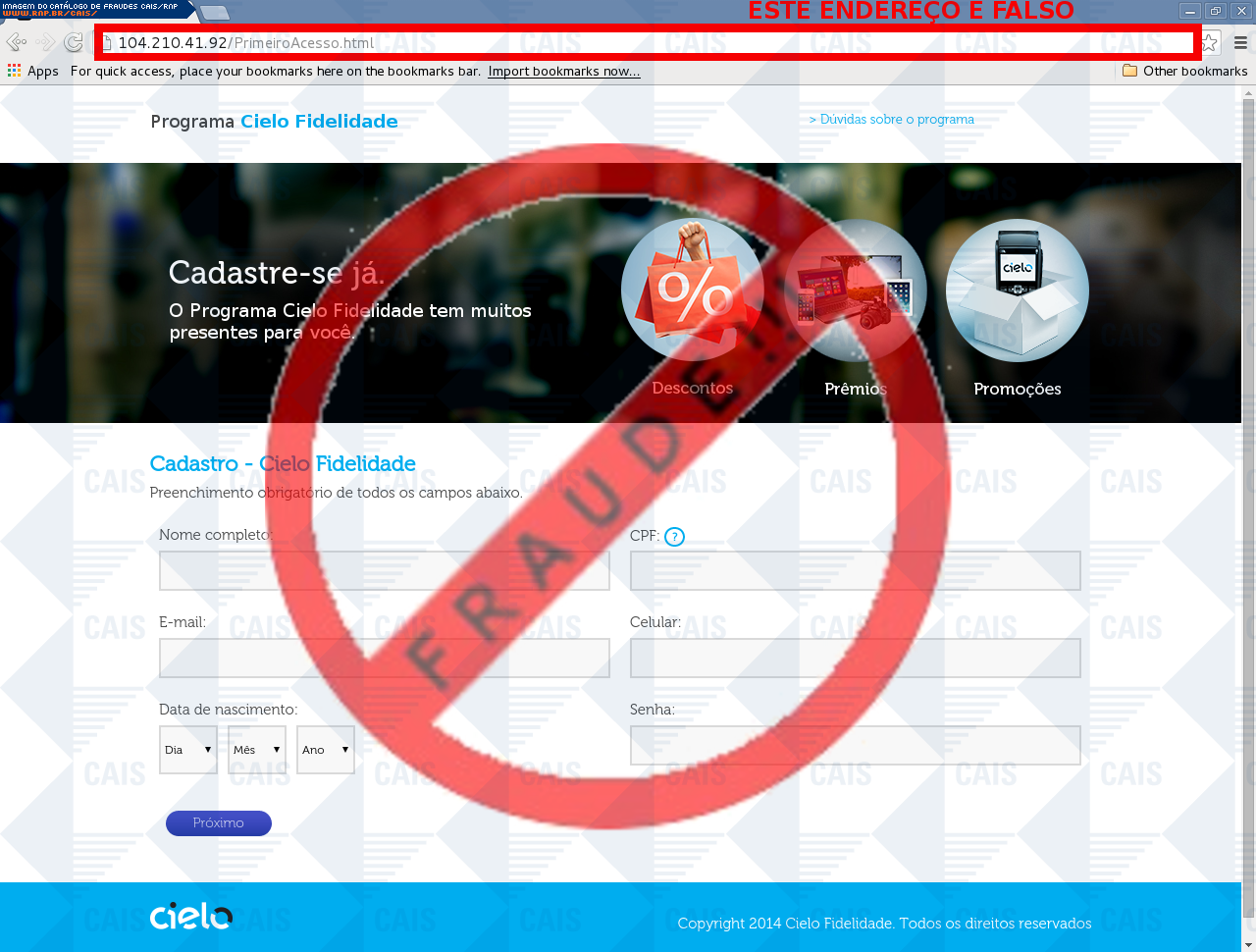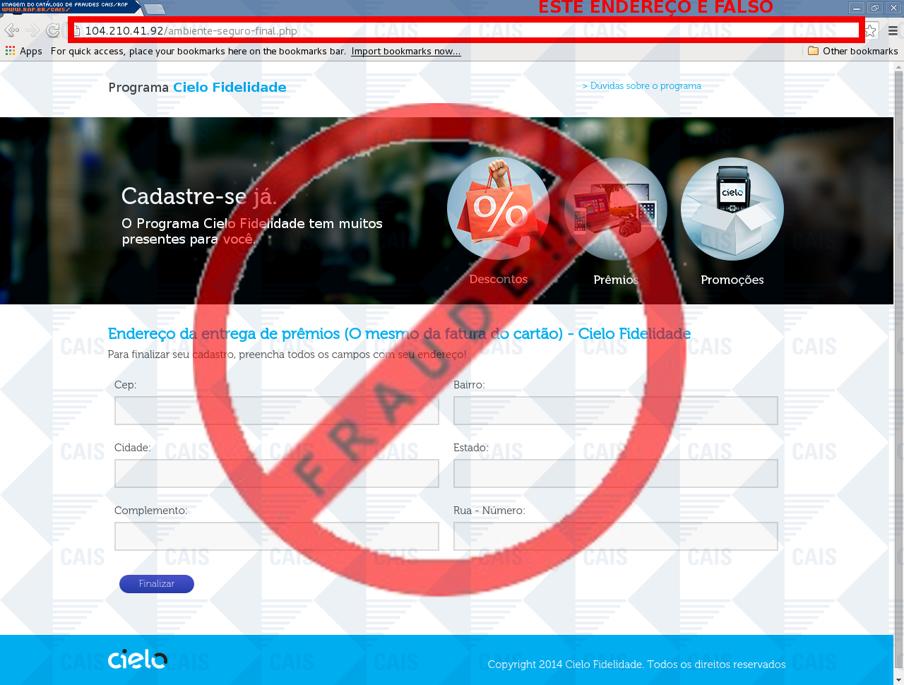 | comentário | A vítima recebe um e-mail informando sobre o programa de vantagens do cartão Cielo sendo necessário realizar um cadastro no link indicado para participar, no entanto a página é falsa destinada a roubar os dados do cartão de crédito do usuário. | |