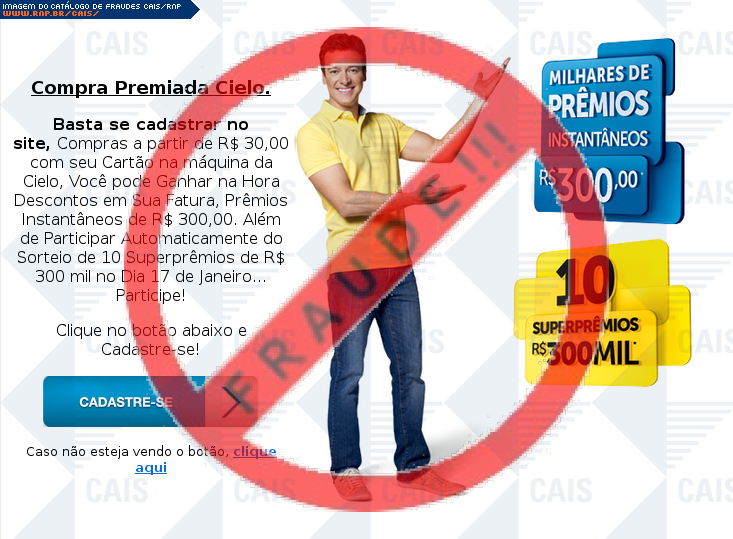 | comentário | A vítima recebe um e-mail informando sobre sorteio de prêmios relacionados a seu cartão Cielo sendo necessário realizar um cadastro, no entanto a página é falsa destinada a roubar os dados do cartão de crédito do usuário. | |