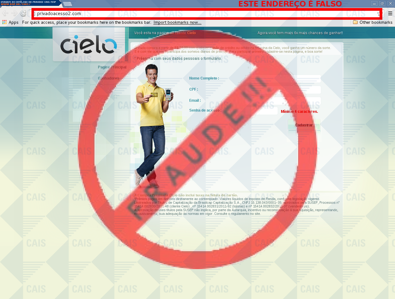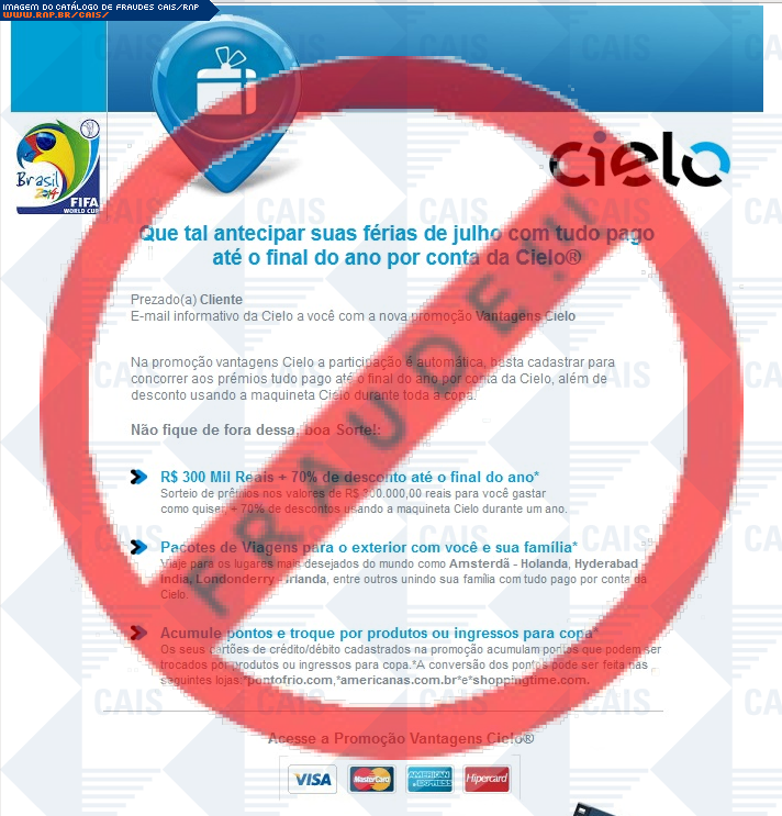 | comentário | A vítima recebe um e-mail informando sobre promoções relacionados a seu cartão Cielo sendo necessário realizar um cadastro, no entanto a página é falsa destinada a roubar os dados do cartão de crédito do usuário. | |