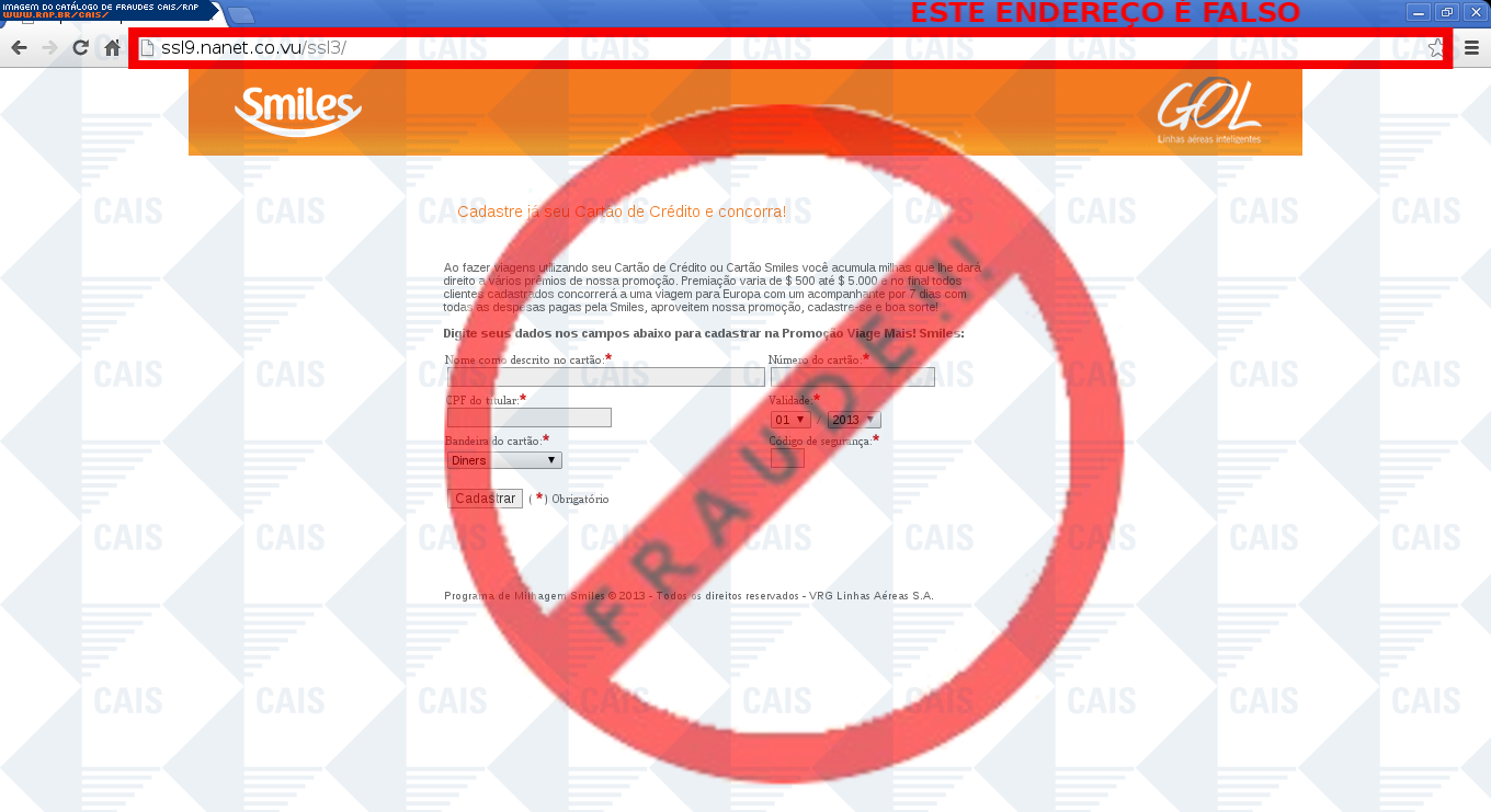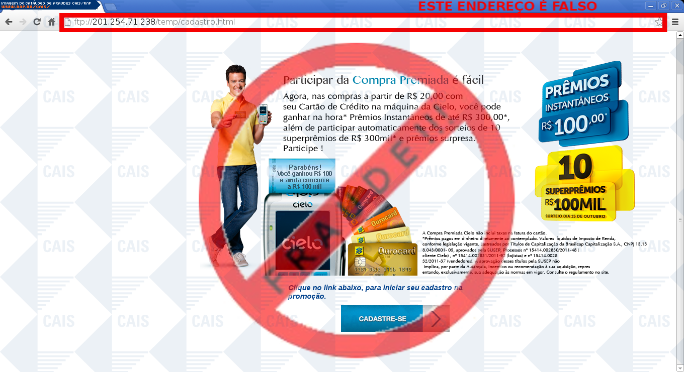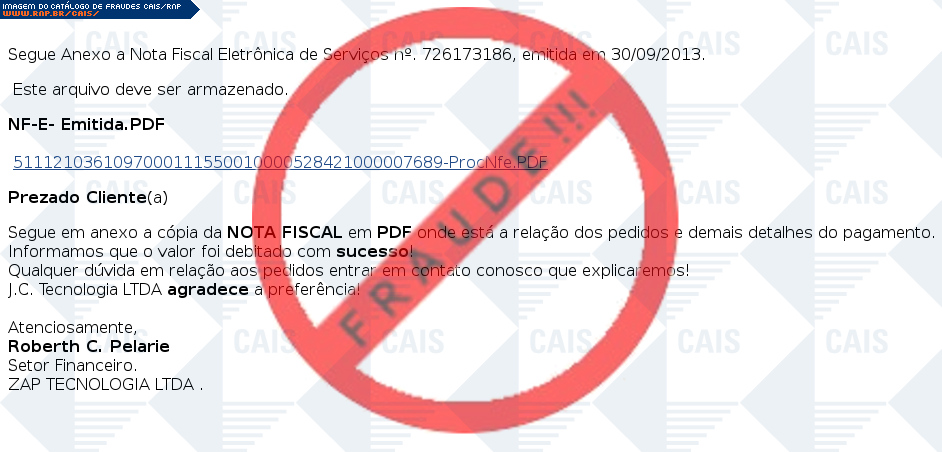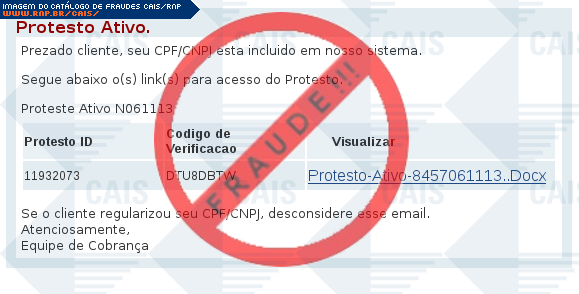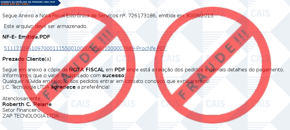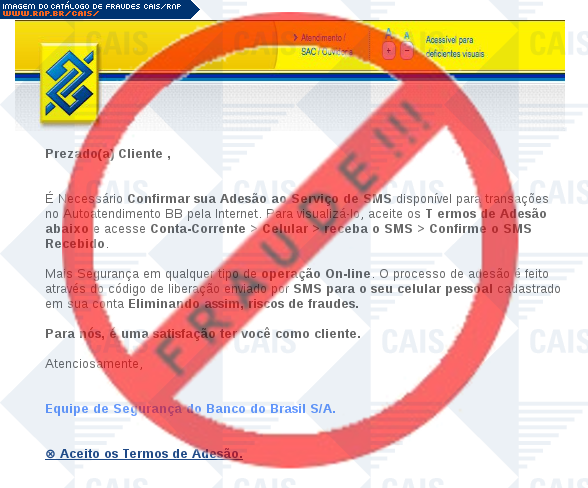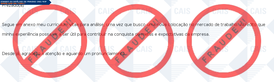 Esta página tem função informativa e educativa. Exibe uma coleção de imagens de phishing scam (fraudes eletrônicas) ou malware (código malicioso) veiculados por meio de spam (e-mail não-solicitado). Trata-se de conteúdo exemplificativo, não exaustivo, uma vez que não é possível contemplar todos os casos de fraudes existentes. Assim, caso você tenha conhecimento de um exemplar que não esteja aqui presente, isto não significa que não seja válido ou real. Inclusive incentivamos que você o envie para análise do CAIS para que, se for o caso, passe a integrar o nosso acervo.