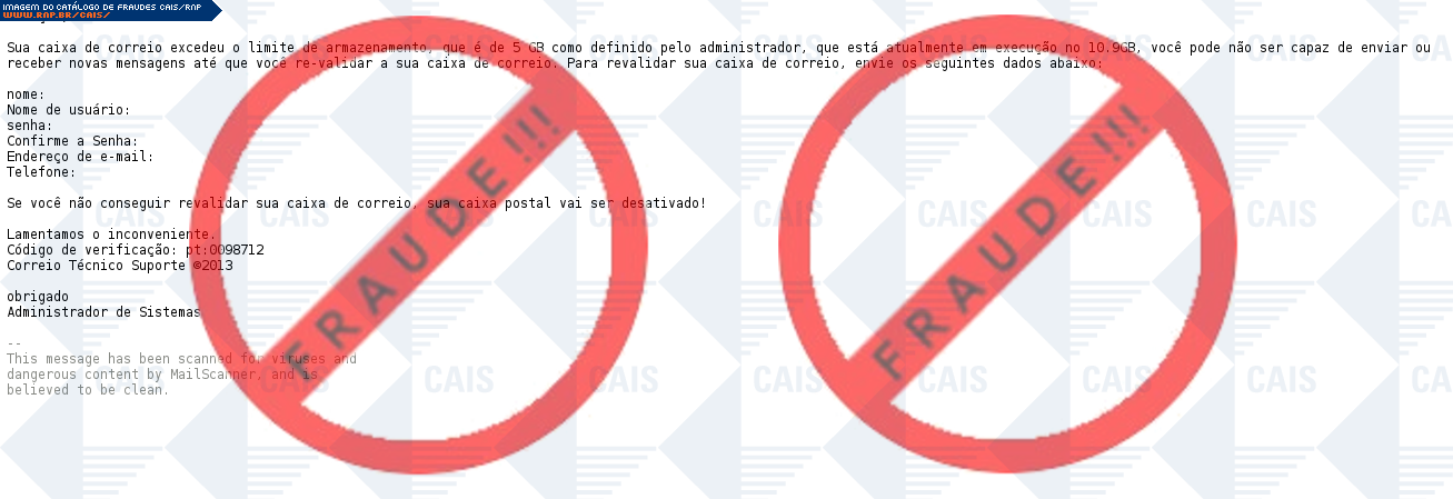 | comentário | A vítima recebe uma mensagem fraudulenta informando do excedente de sua quota de email. É pedido que a vítima envie responda ao email informando suas credenciais de acesso. | |