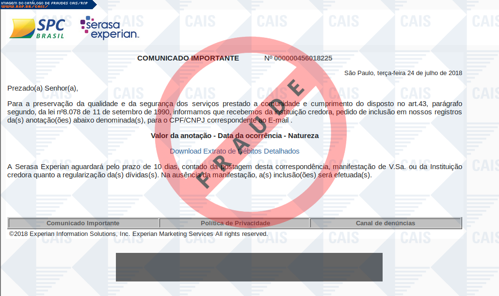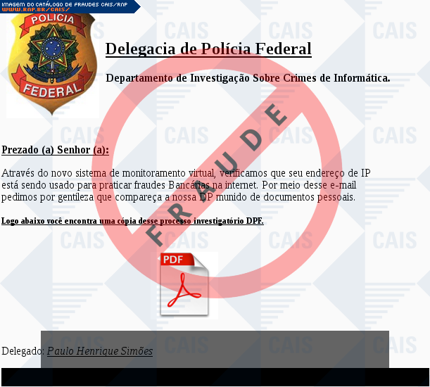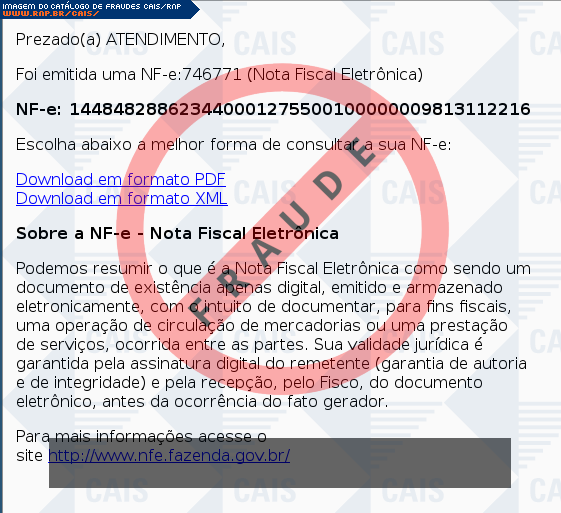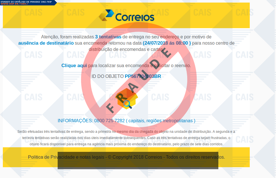 Esta página tem função informativa e educativa. Exibe uma coleção de imagens de phishing scam (fraudes eletrônicas) ou malware (código malicioso) veiculados por meio de spam (e-mail não-solicitado). Trata-se de conteúdo exemplificativo, não exaustivo, uma vez que não é possível contemplar todos os casos de fraudes existentes. Assim, caso você tenha conhecimento de um exemplar que não esteja aqui presente, isto não significa que não seja válido ou real. Inclusive incentivamos que você o envie para análise do CAIS para que, se for o caso, passe a integrar o nosso acervo.
