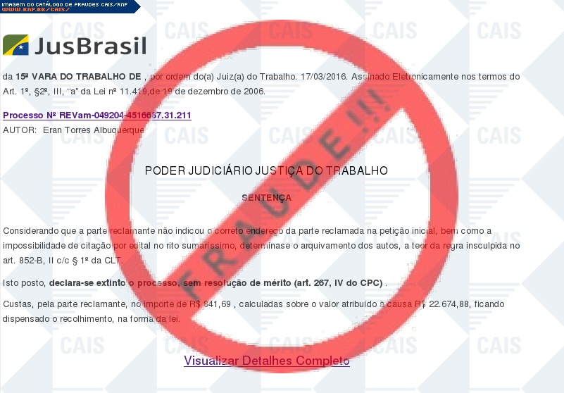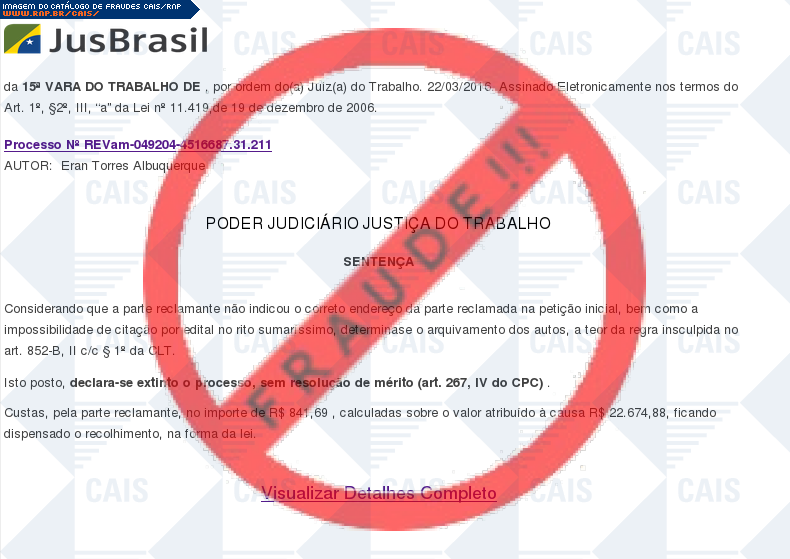 | comentário | A vítima recebe uma mensagem dizendo que foi sentenciada a pagar cerca de R$800,00 por decisão judicial e passa um link para visualização dos detalhes da decisão. Porém, o link leva ao download de um malware de nome Trojan.Win32.Generic.pak!cobra. | |