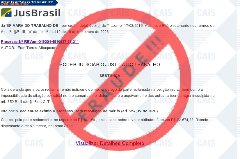 | comentário | O usuário recebe uma mensagem contendo um processo judicial disponível para download, no entanto o arquivo originado é malicioso criado para roubar informações da vítima e instalar outros arquivos fraudulentos com o nome de Trojan.Crypt.RV. | |